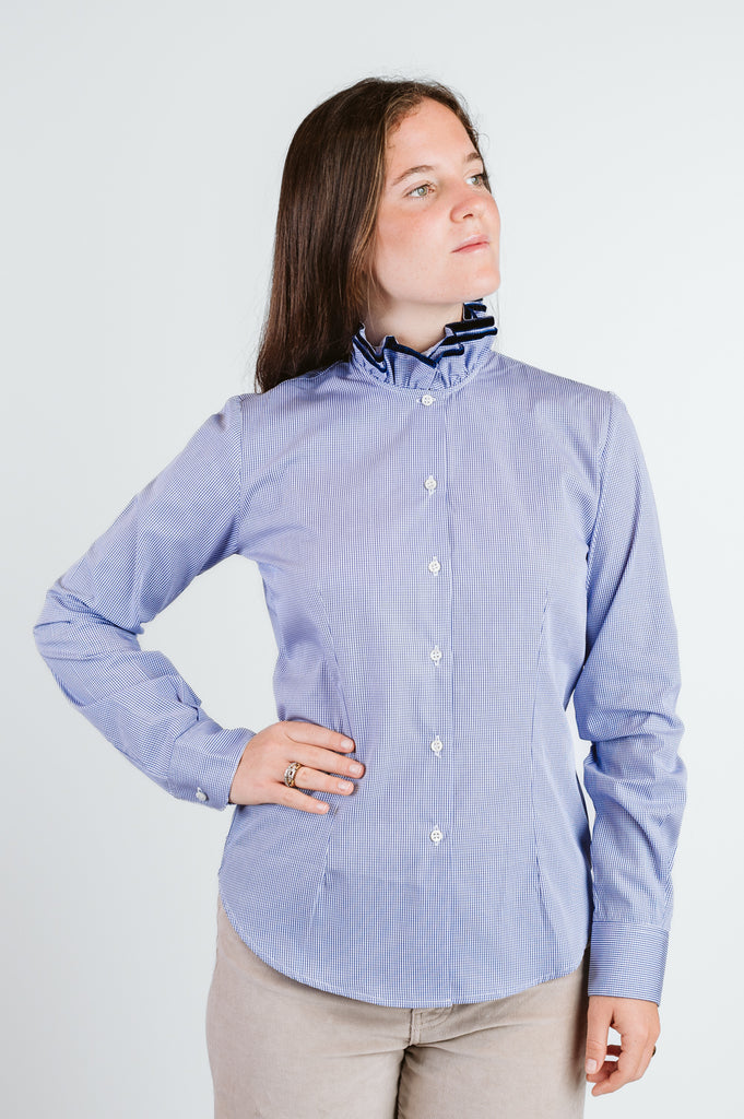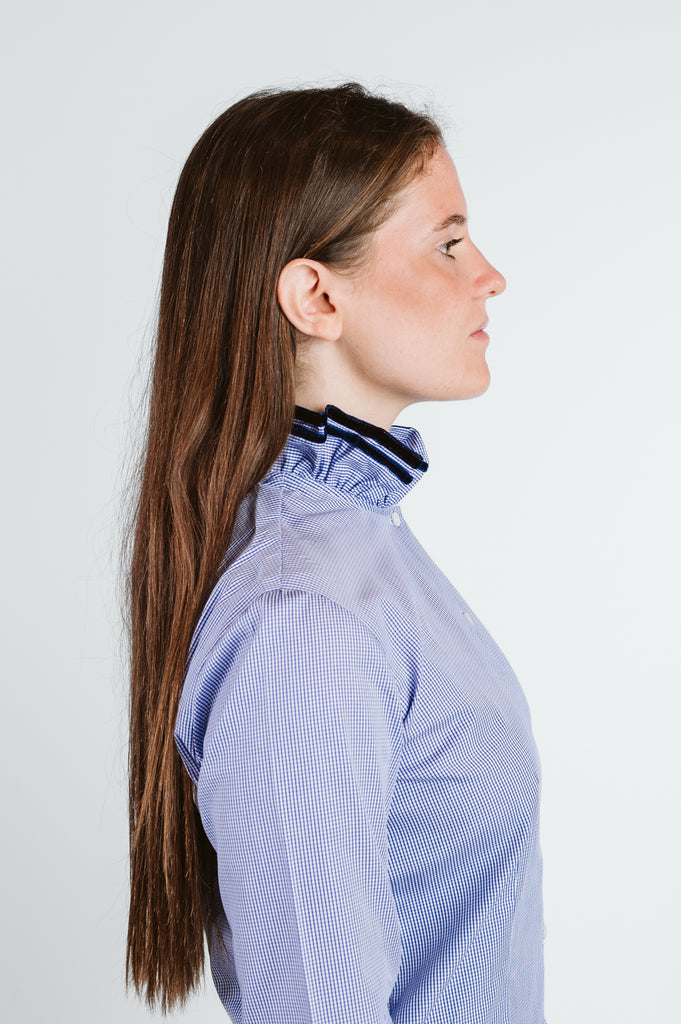 La camicia Carlotta, simbolo di eleganza, presenta una doppia maxi rouche sul collo impreziosita da un delicato profilo in velluto liscio. La vestibilità regular è valorizzata da quattro pinces, due sul davanti e due sul retro. Realizzata in puro cotone 100% con motivo a quadretti in due colori, è rifinita con bottoni in autentica madreperla.