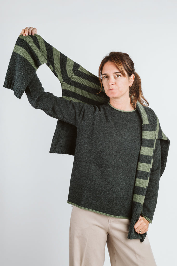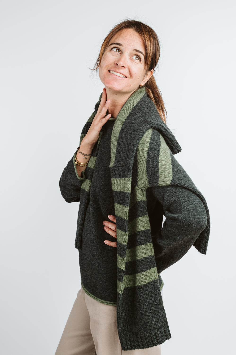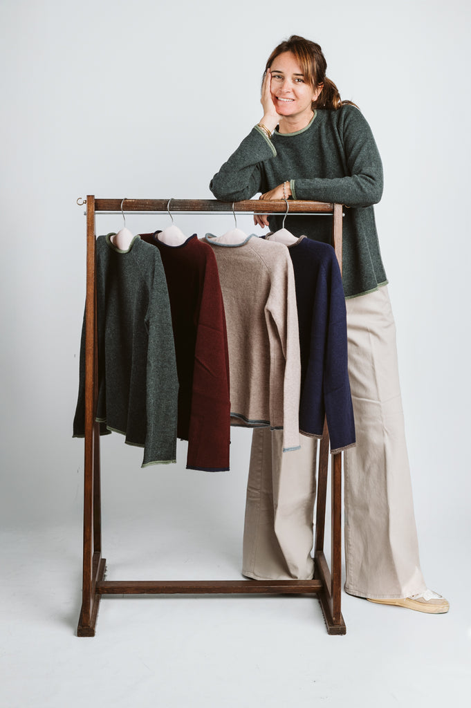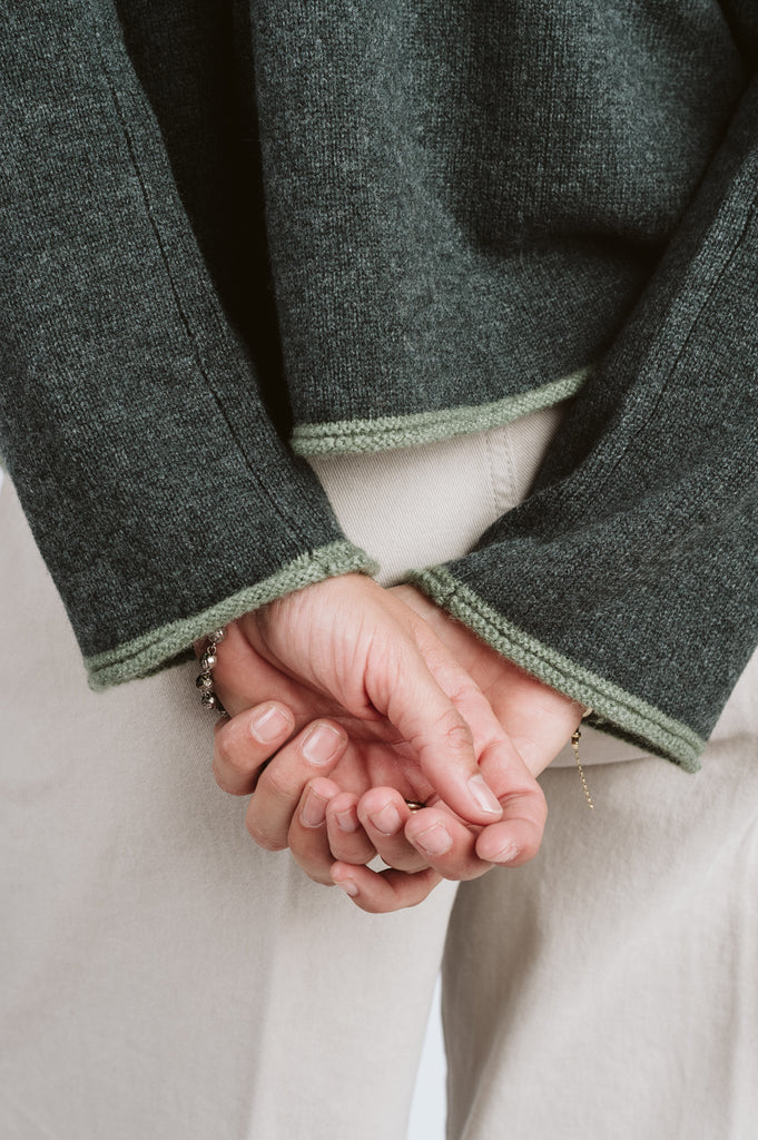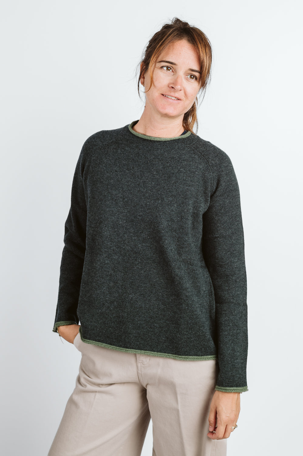 Maglione collo rotolino con bordino in contrasto sul collo e suo polsini, lavorato sulla 7