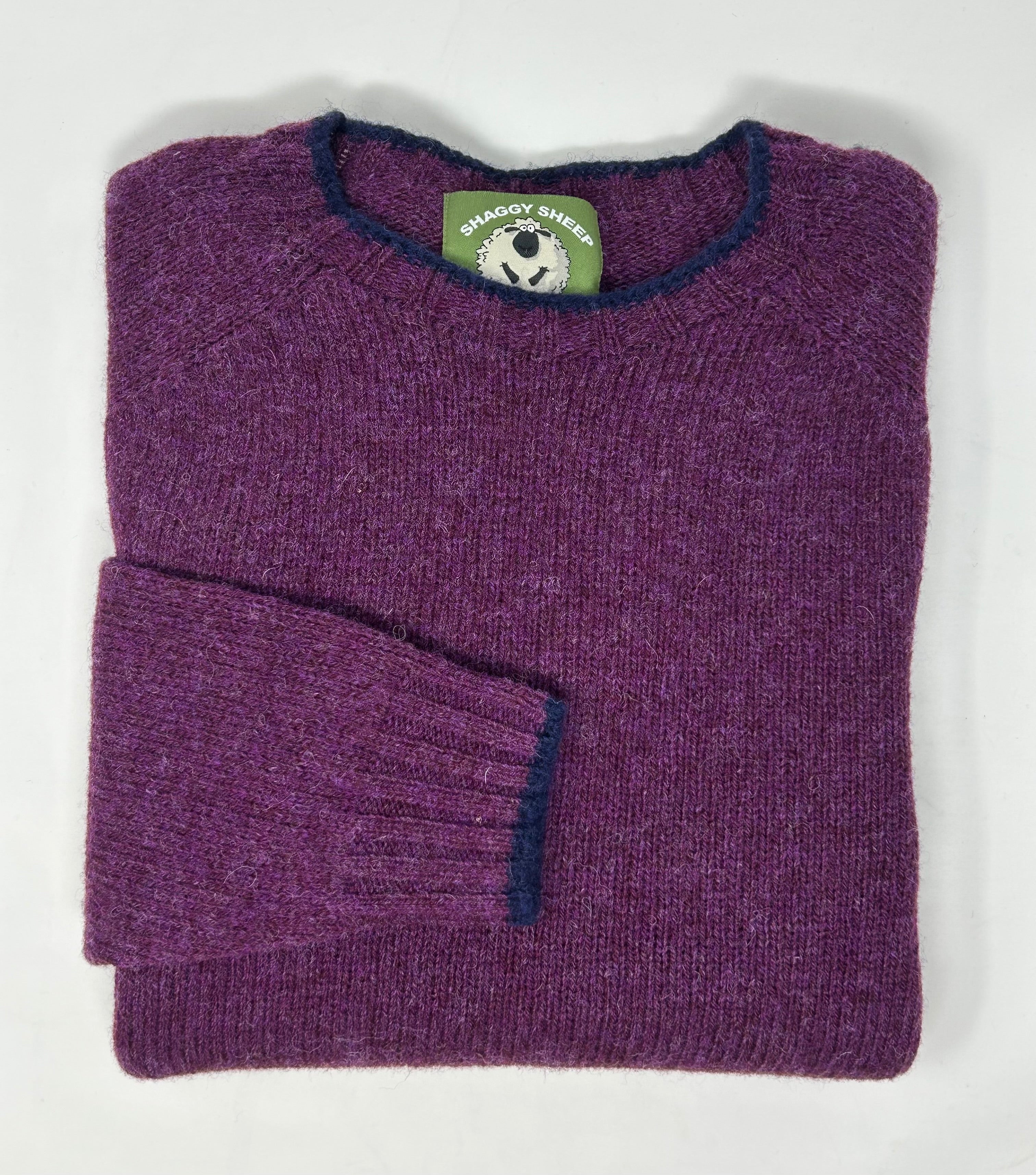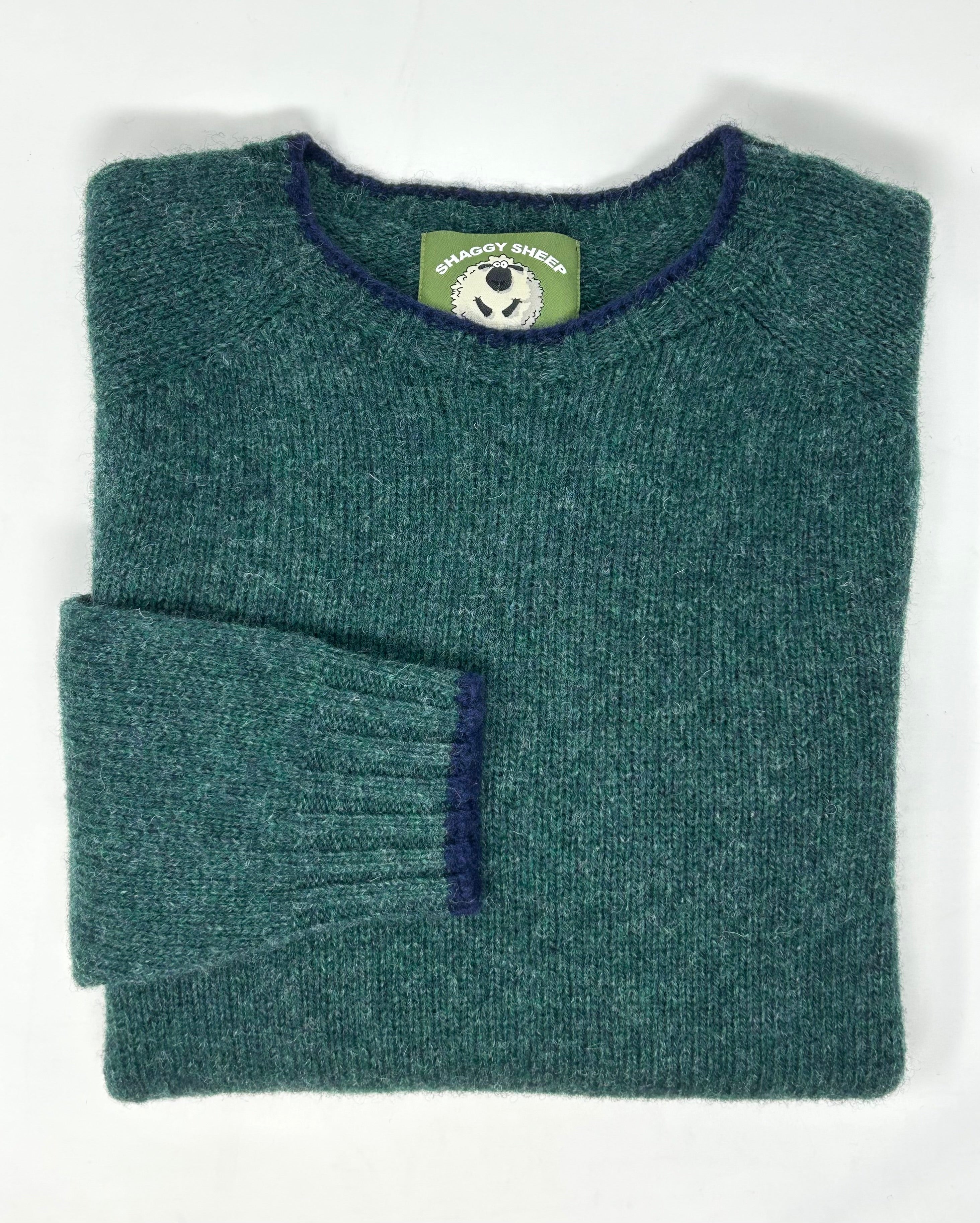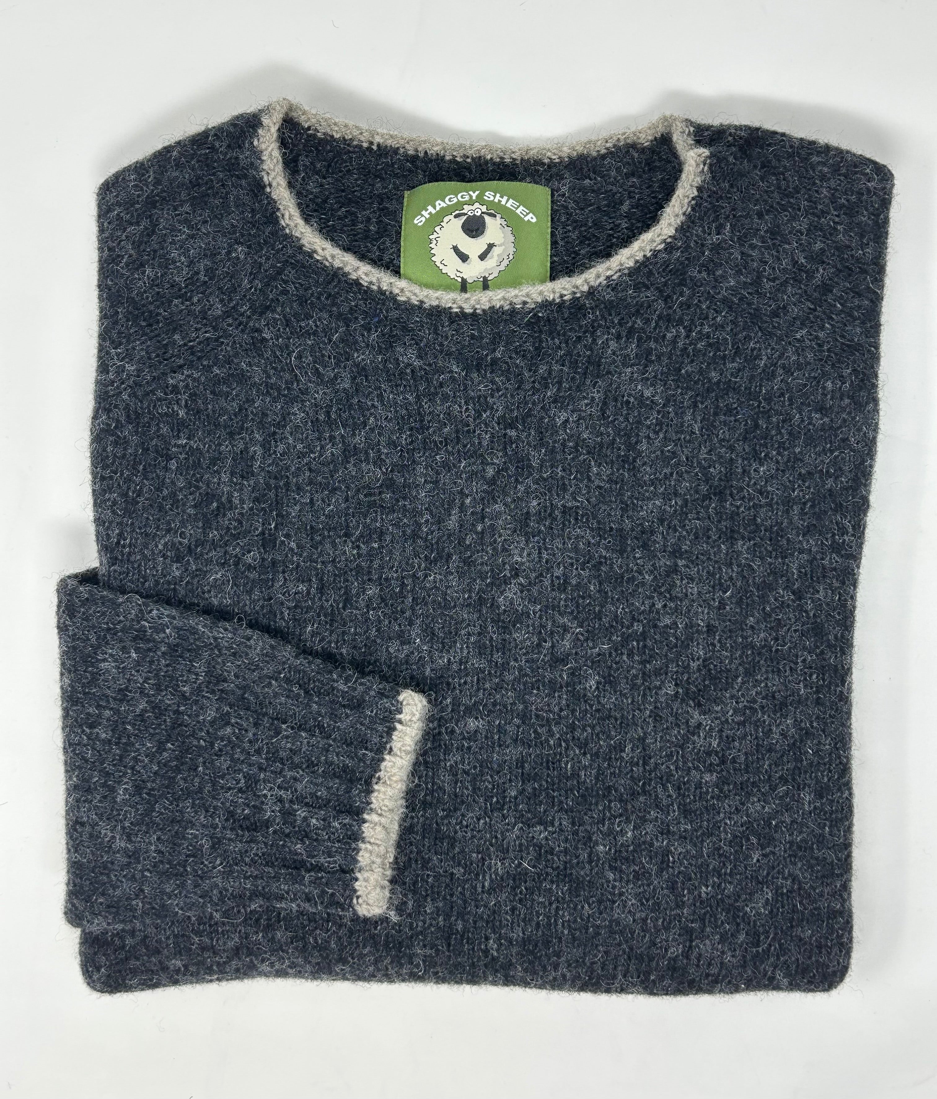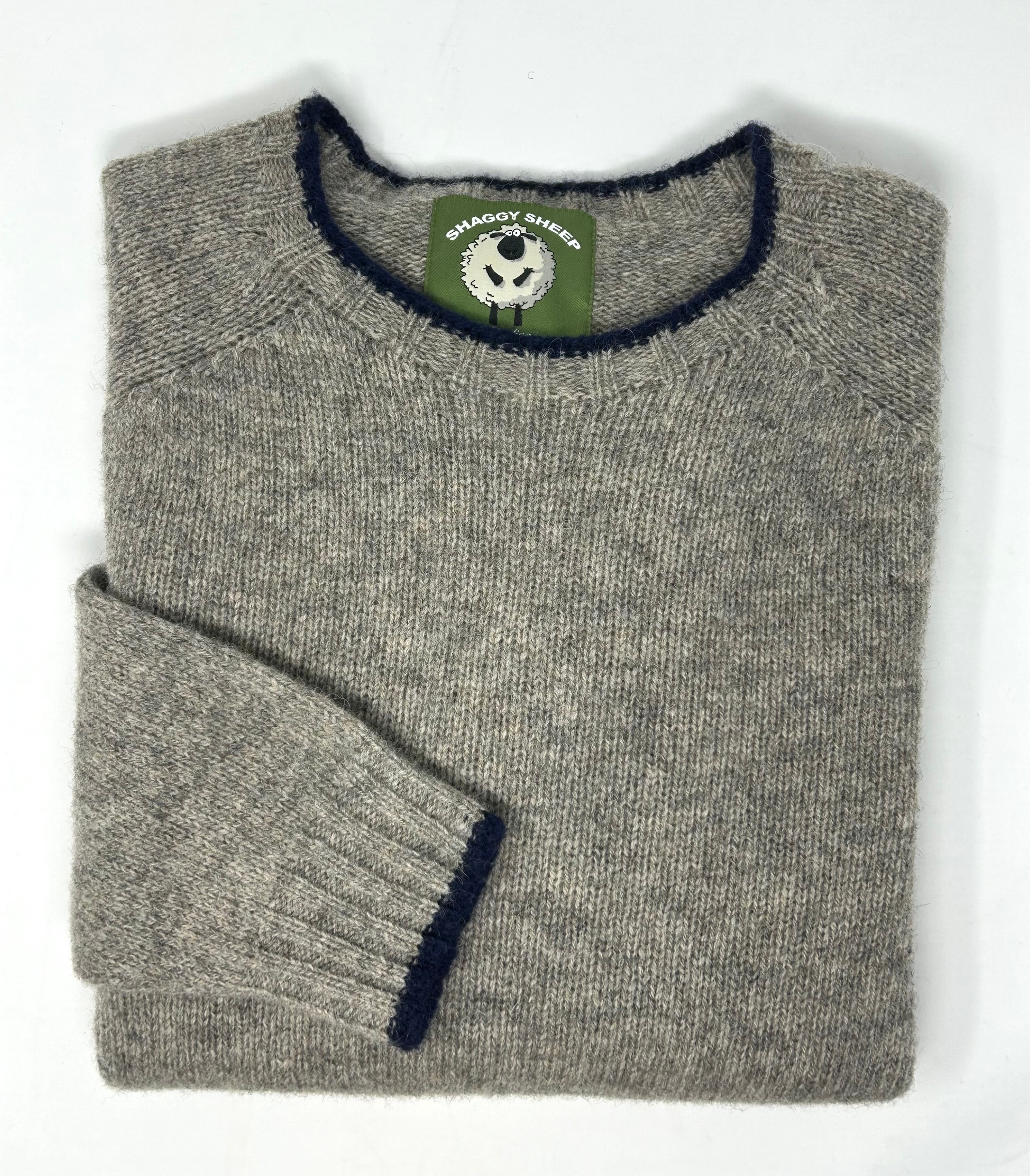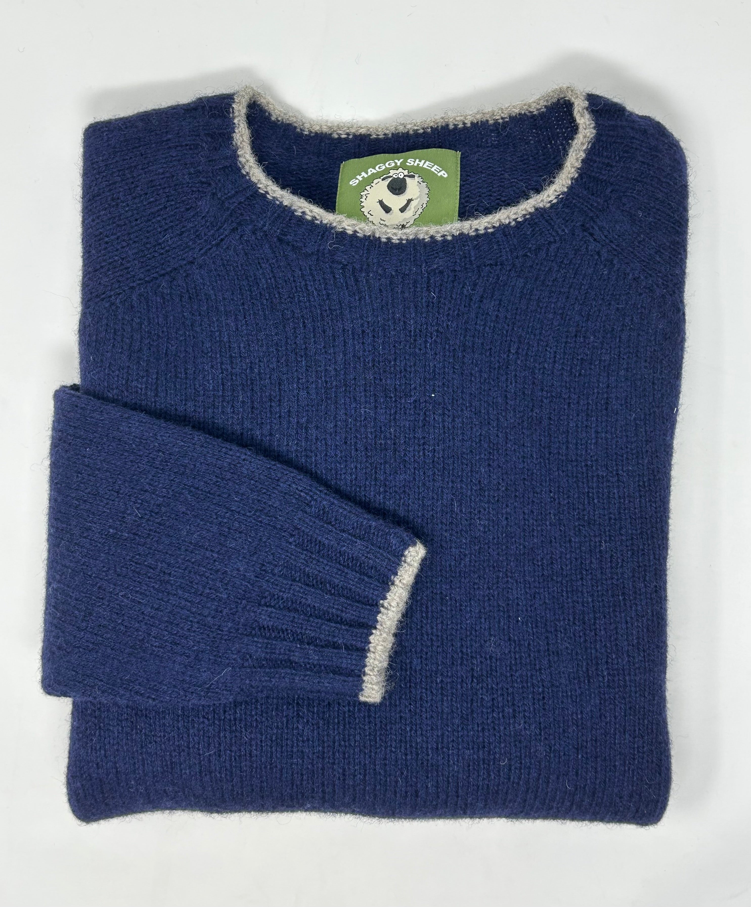 Maglione in Shetland, spalla a martello, costruzione tubolare (senza cuciture sul fianco) con bordino colore in contrasto nel collo e sui polsini
