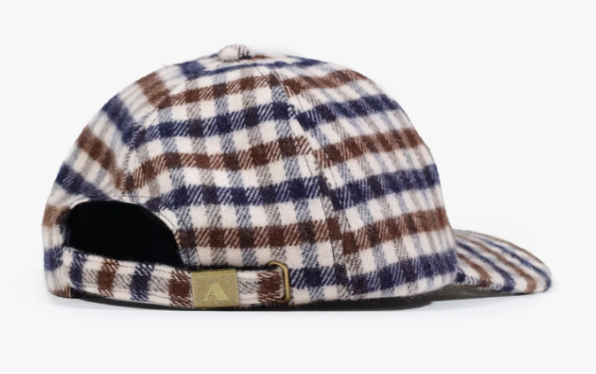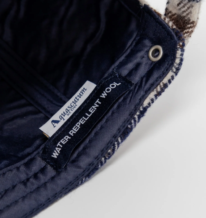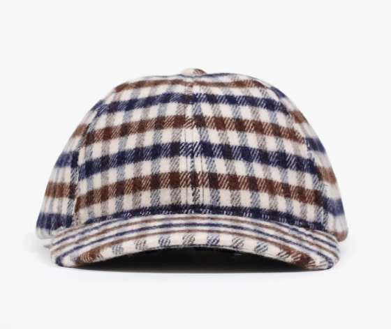 Berretto baseball in tessuto 100% Merino, smacchinato in Club Check, trattato con una leggera resinatura a spray per creare la caratteristica di articolo repellente all'acqua. Etichetta tessuto posizionata sul lato interno.