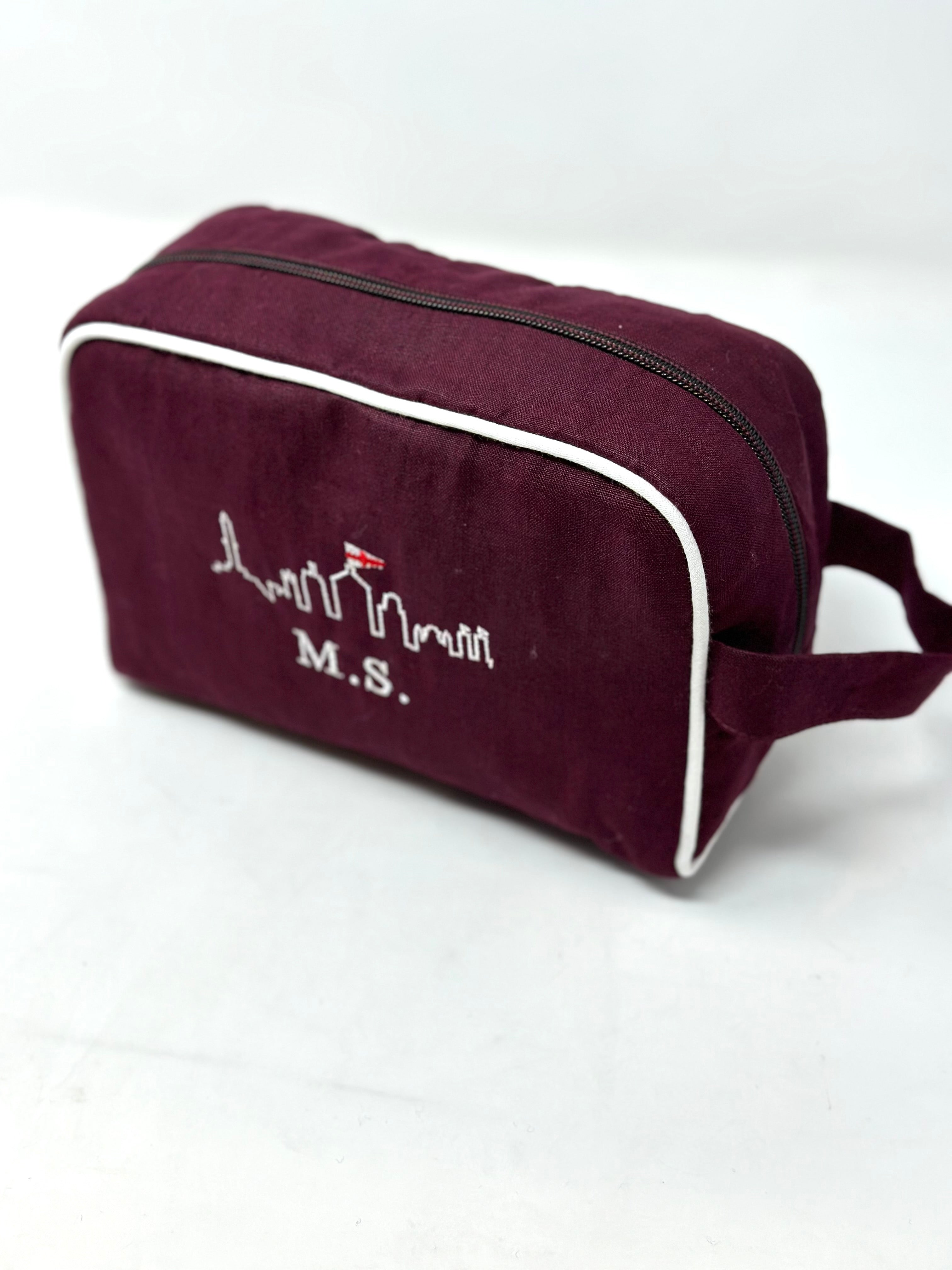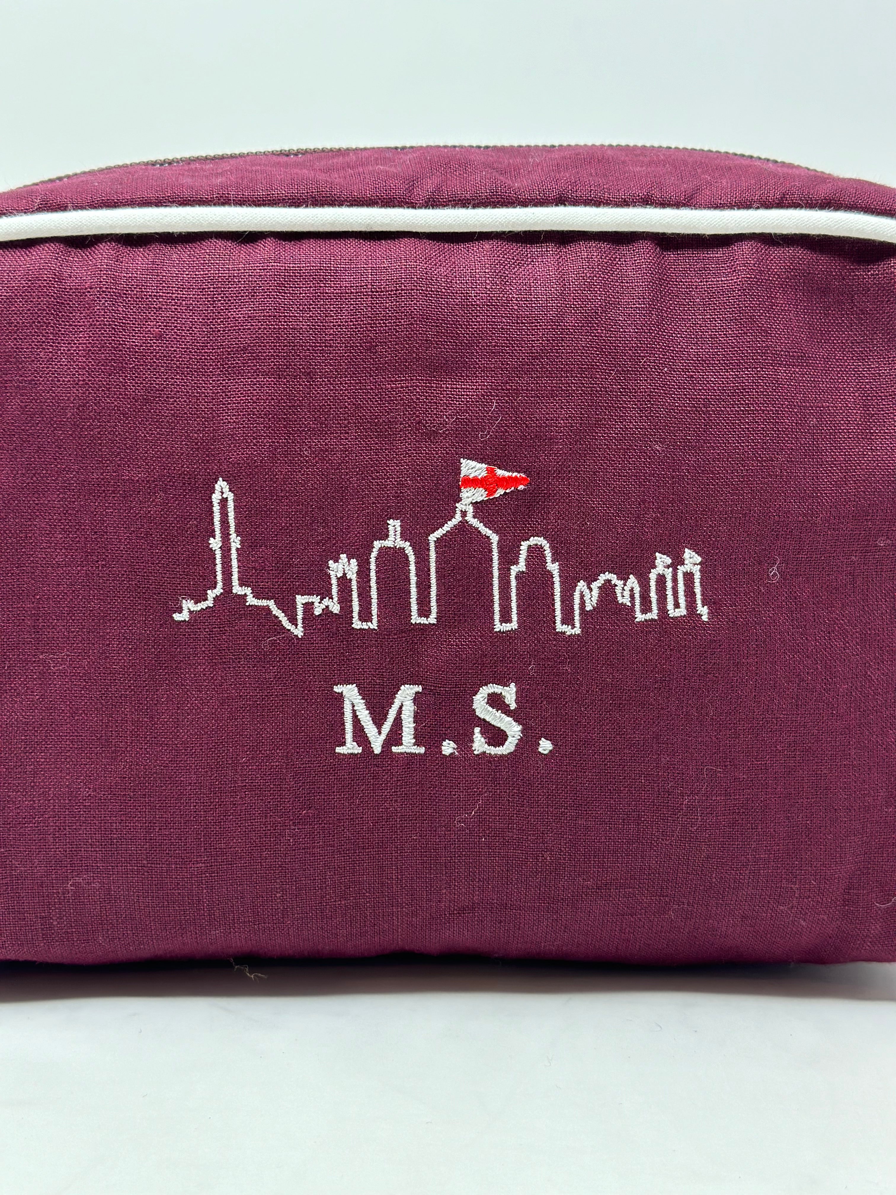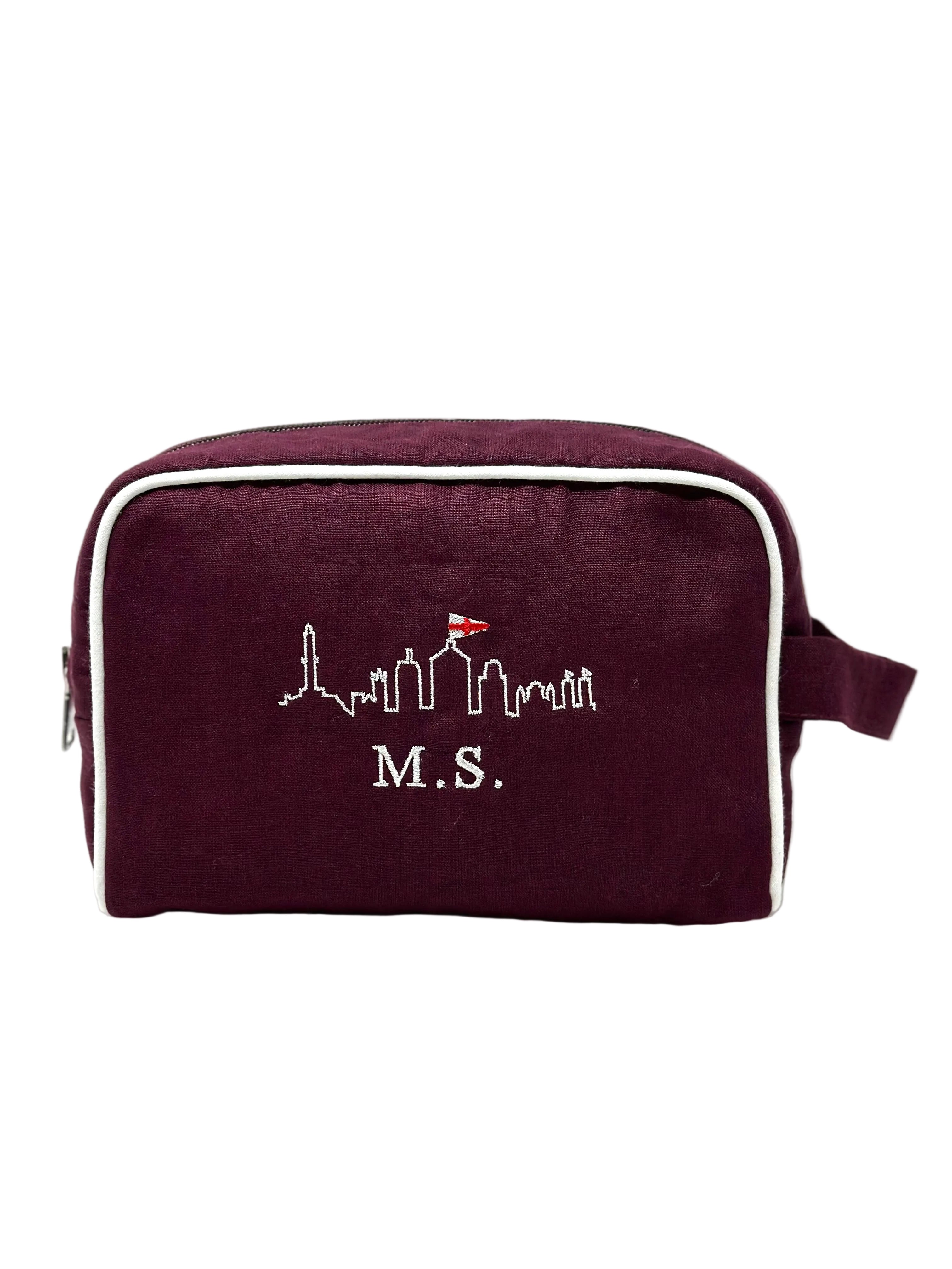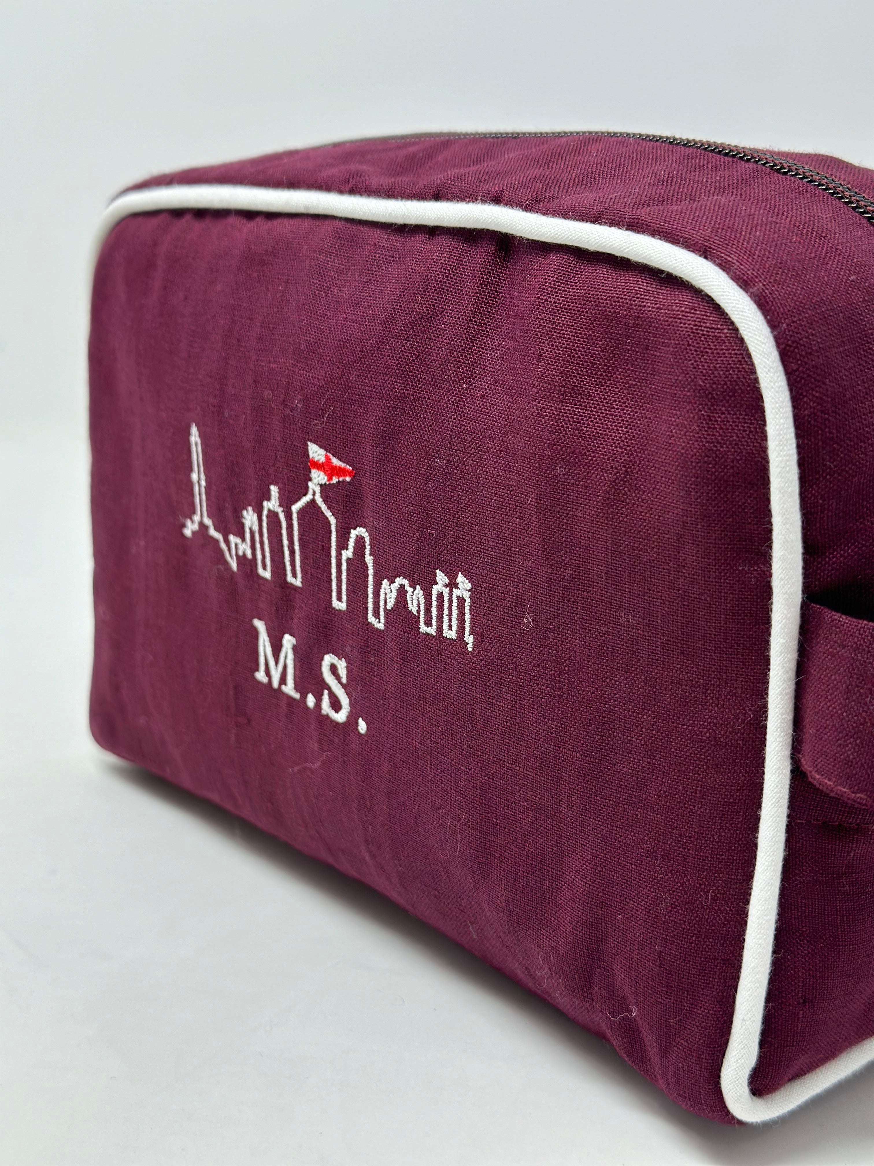 Il beauty case MONOGRAM STYLE di GHIGLINO1893 personalizzato con il nostro ricamo esclusivo “Genova Skyline” e iniziali sotto. realizzato in lino 100% di alta qualità. Le sue dimensioni compatte di 20 cm x 13 cm x 9 cm lo rendono perfetto per organizzare i tuoi prodotti di bellezza con eleganza.