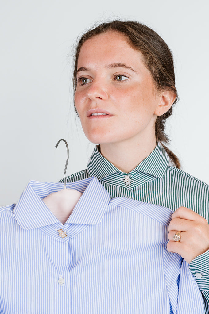 La camicia Erika si distingue per il suo sofisticato pattern a righe bastoncino e l'elegante colletto arrotondato. La silhouette, confortevole e leggermente trapezoidale, è valorizzata da raffinati spacchetti laterali. Bottoni in vera madreperla con primo a forma di orsetto.Confezionata in pregiato cotone oxford 100%, questa creazione rappresenta l'autentica maestria sartoriale italiana di Ghiglino1893.