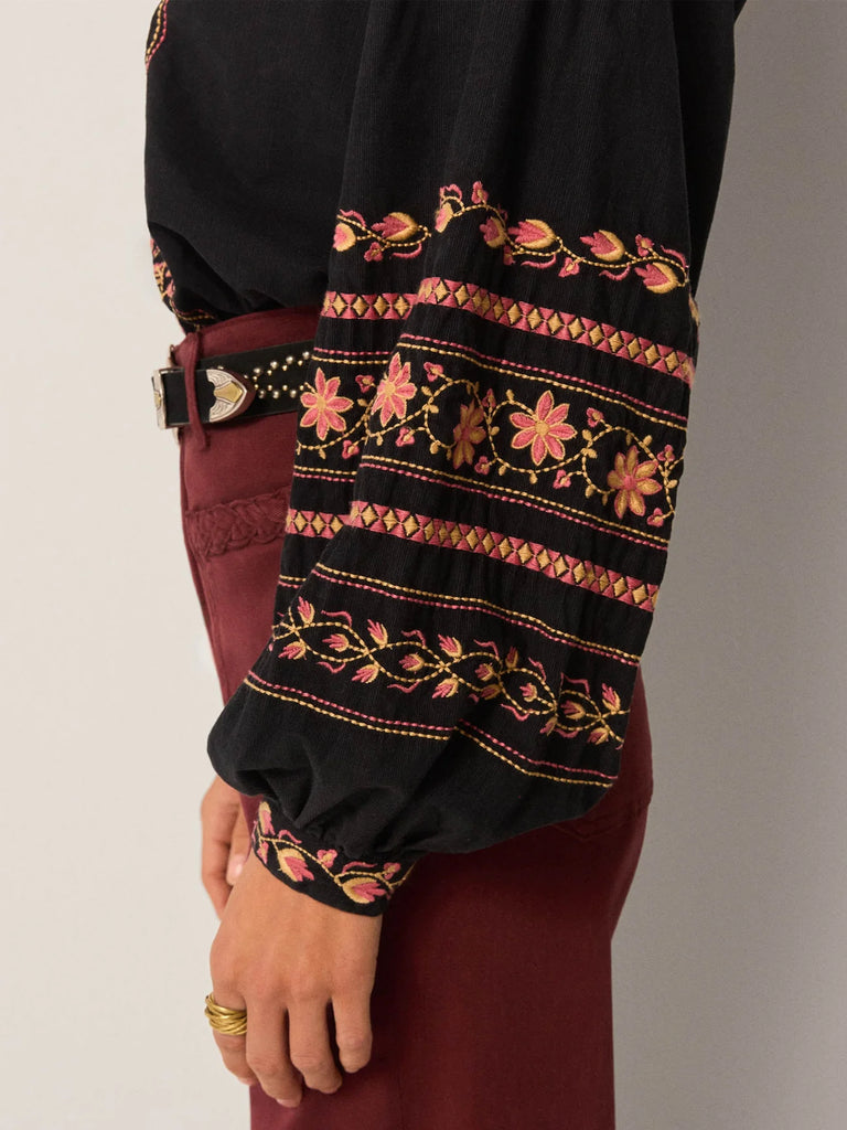 I fiori in rosa, uva e ocra si arrampicano sul petto e sulle maniche, illuminati su un terreno nero. Il ricamo è denso e intricato, assomiglia all'opera di arazzo sia ornata che viva.
