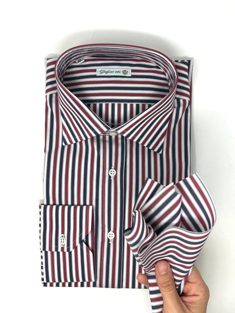 Collo Liverpool, una via di mezzo tra colletto alla francese e quello inglese, leggermente inclinato sul fondo, stabile nella struttura ma morbido e confortevole.