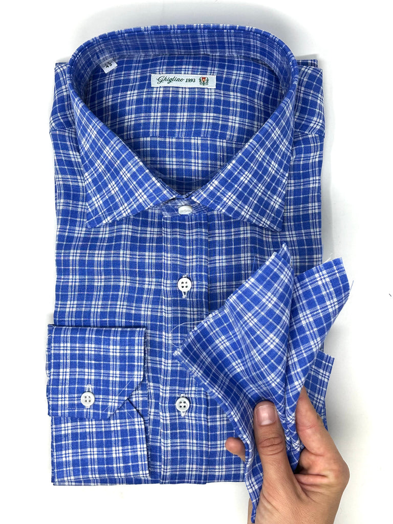 Collo Liverpool, una via di mezzo tra colletto alla francese e quello inglese, leggermente inclinato sul fondo, stabile nella struttura ma morbido e confortevole.