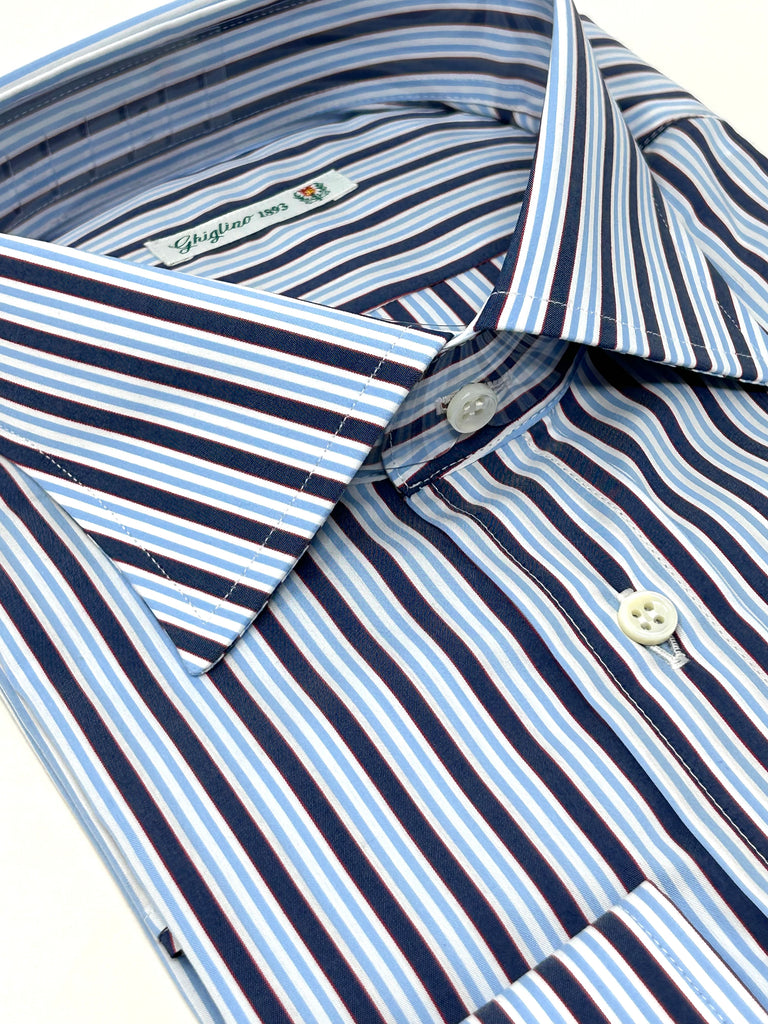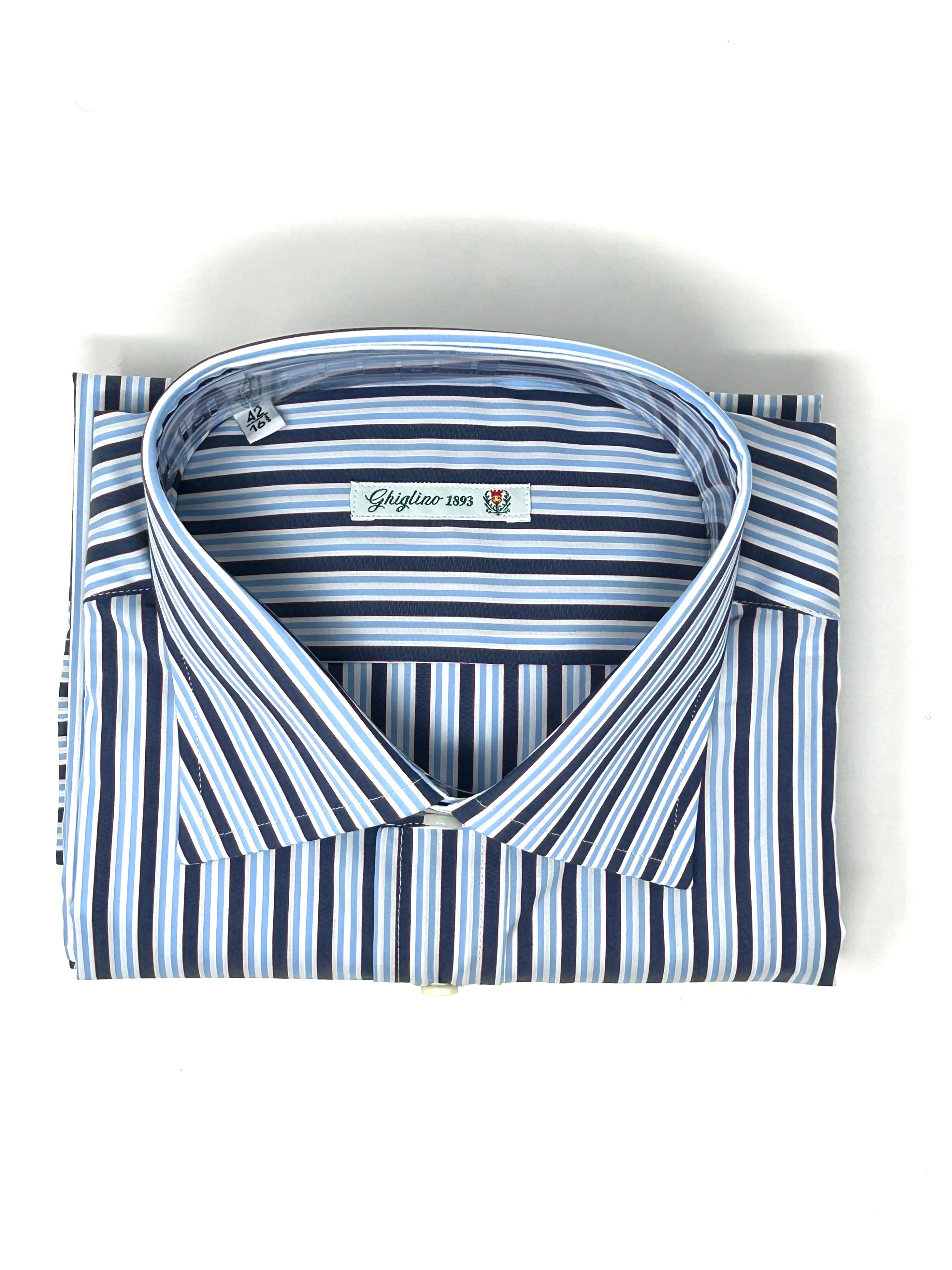 Collo Liverpool, una via di mezzo tra colletto alla francese e quello inglese, leggermente inclinato sul fondo, stabile nella struttura ma morbido e confortevole.