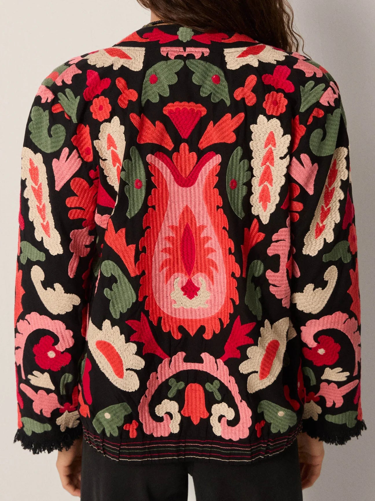 Fiori in rosa, rosso e verde sbocciano sulla superficie, densamente ricamati e sollevati al tatto. I bordi incorniciano i bordi, dando alla giacca la sua struttura ornamentale artigianale.