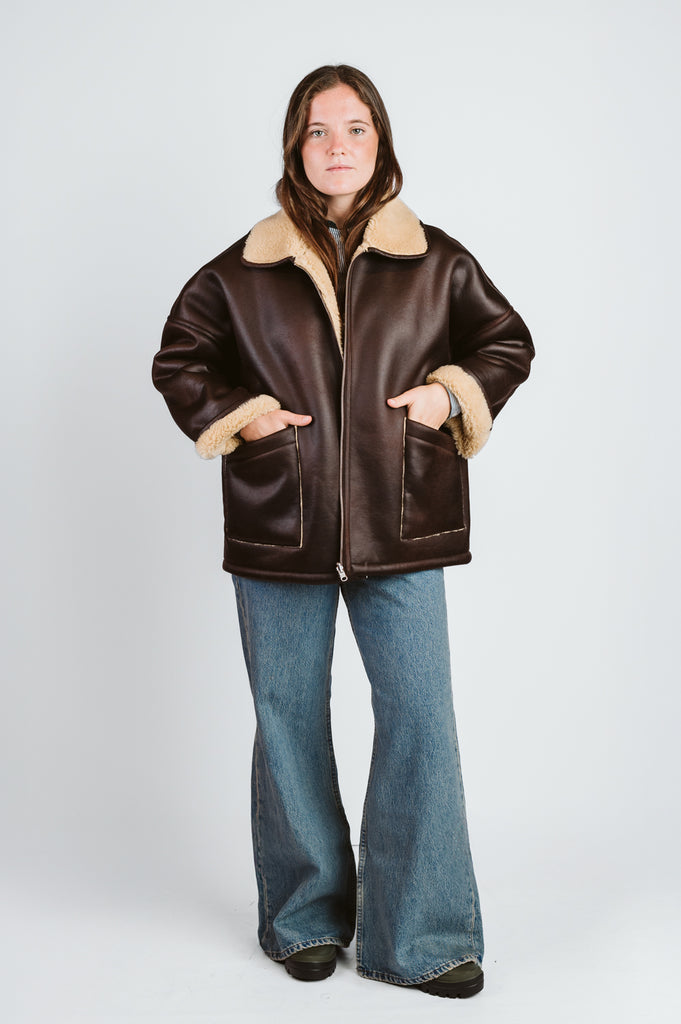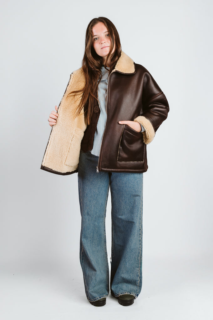 Montone reversibile oversize con un lato in ecopelle e un lato in pile di orsacchiotto