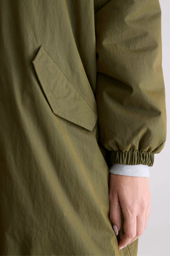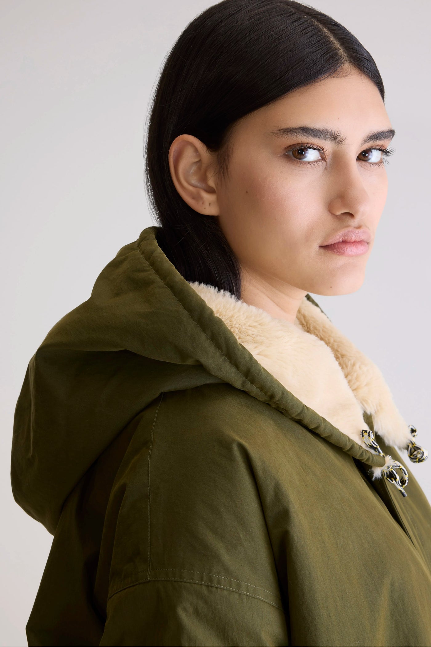 Parka oversize con cappuccio in tela verde oliva con maniche raglan e orli elastici e foderato in pelliccia sintetica ecru.