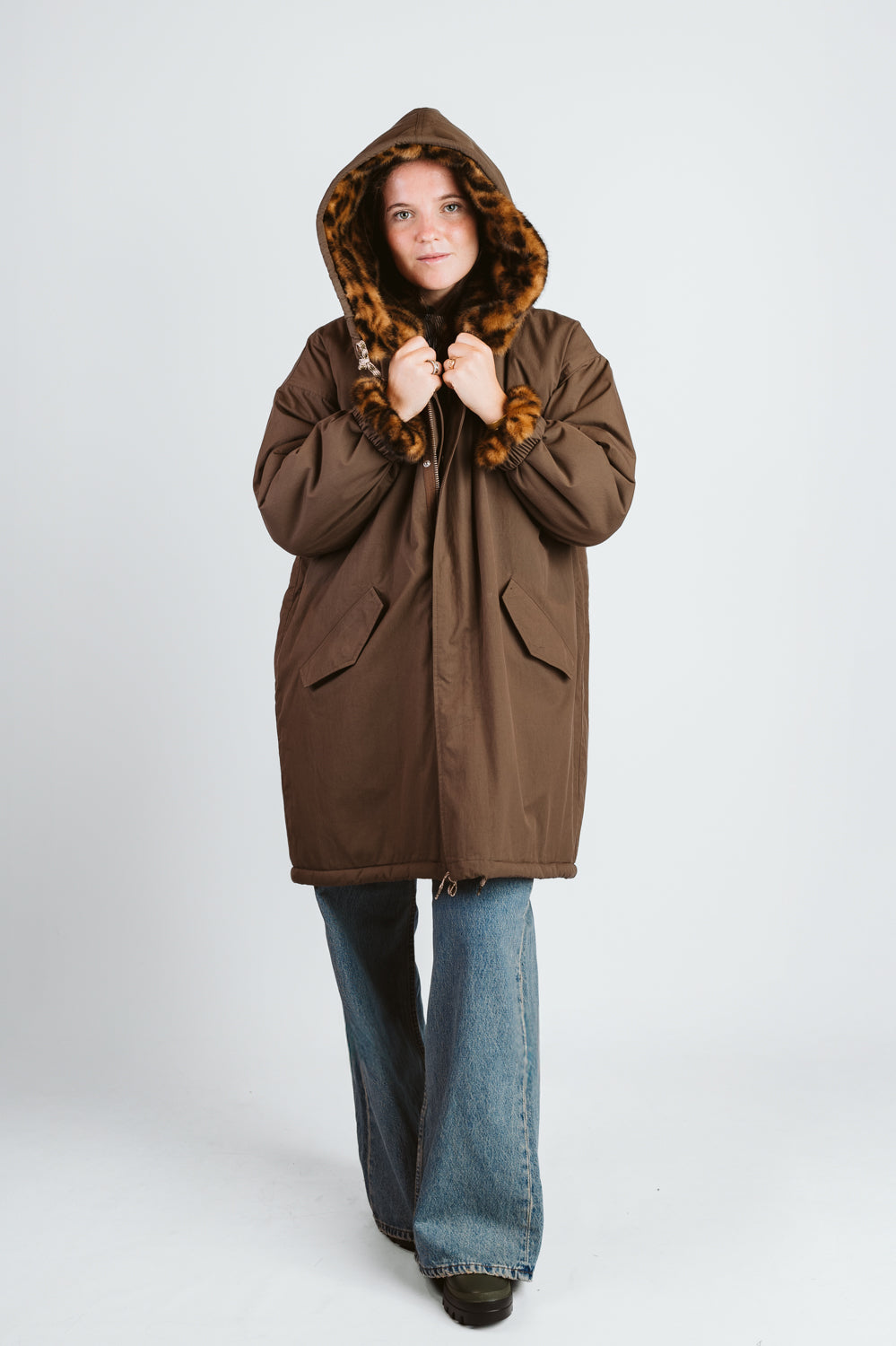 Parka oversize con cappuccio in tela verde salvia, foderata con pelliccia sintetica con stampa leopardata.