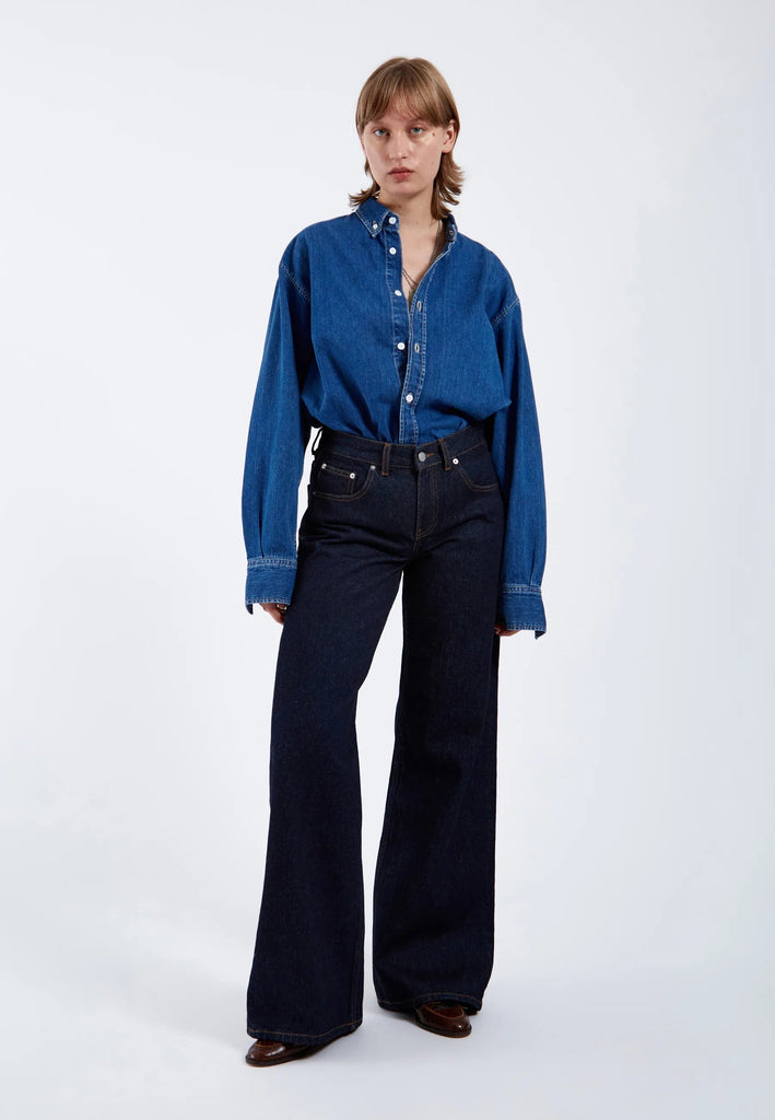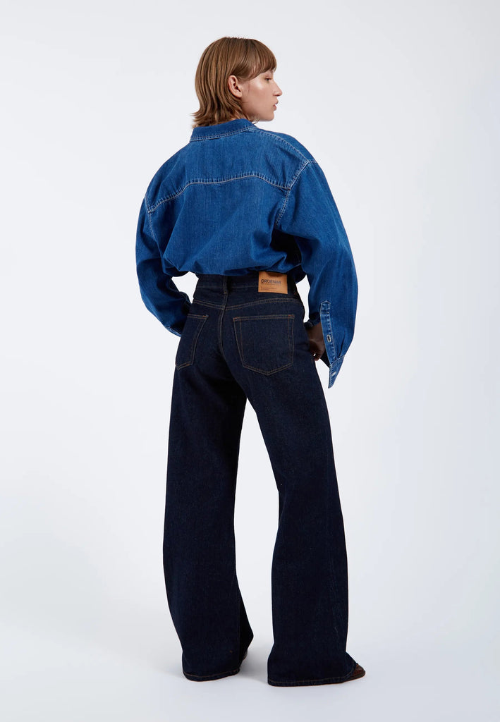 Camicia oversize in denim con una vestibilità ampia e confortevole. Presenta una chiusura a bottoni e un tessuto di denim rigido, realizzato interamente in cotone 100%, per un look elegante e strutturato.