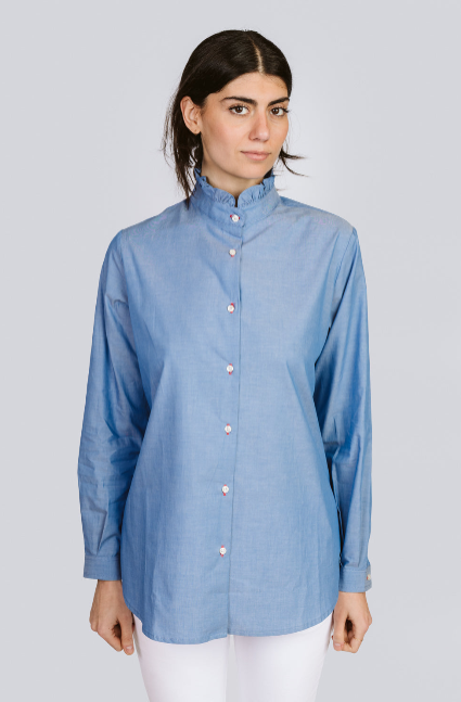 Scopri la camicia ALEX : collo alla coreana rifinito in velluto , bottoni in vera madreperla e una vestibilità oversize per uno stile raffinato e rilassato.