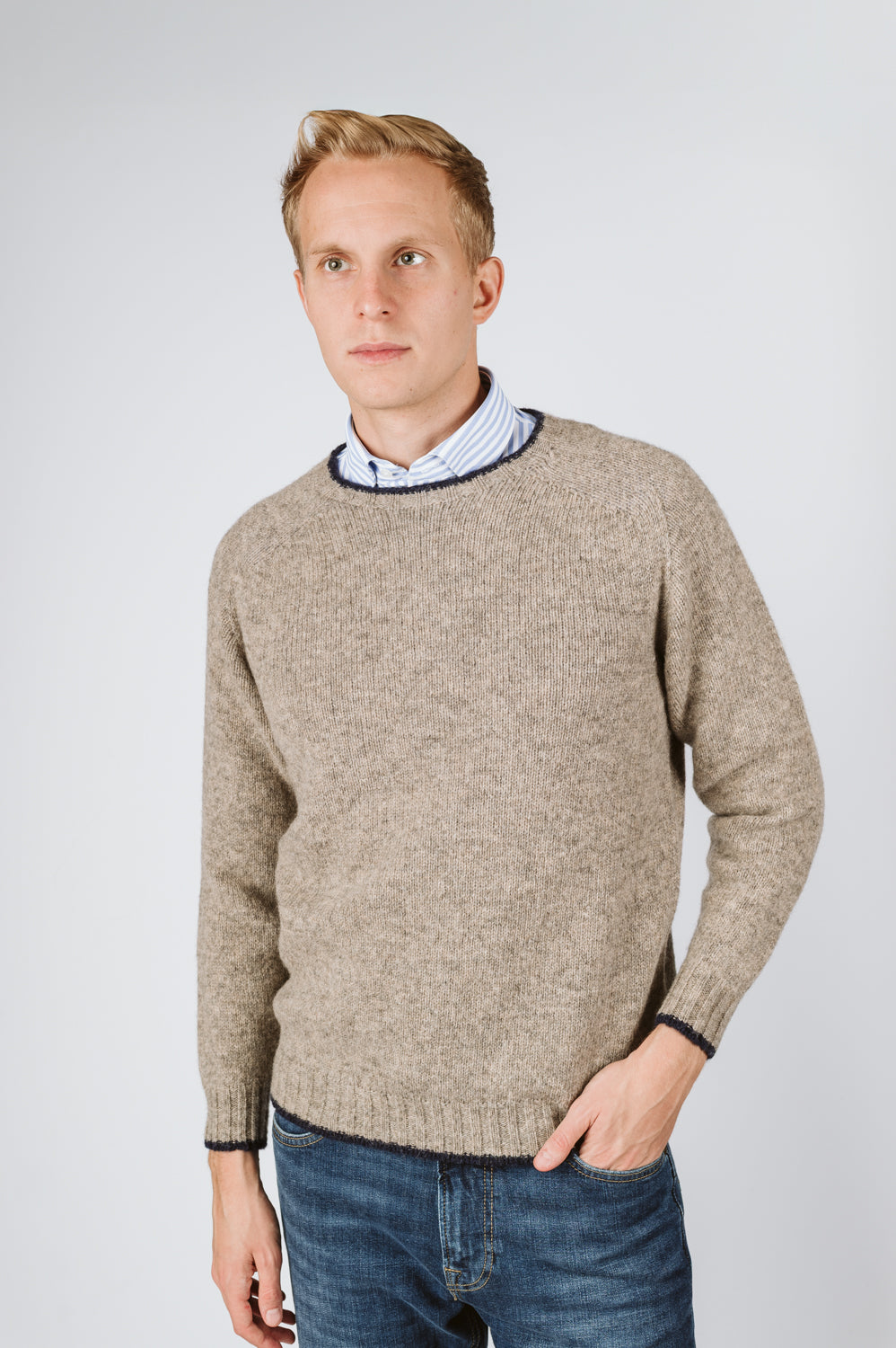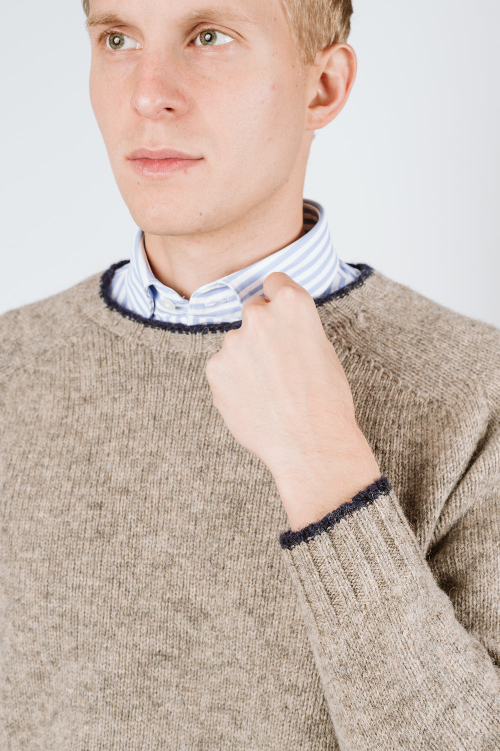 Maglione realizzato in pura lana vergine Shetland, caratterizzato da una spalla a martello e una lavorazione tubolare senza cuciture laterali. Presenta un raffinato bordo a contrasto sul collo e sui polsini, esaltando la qualità dei materiali.