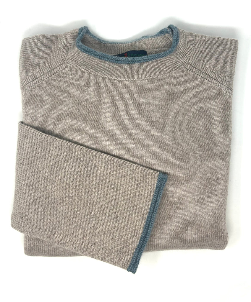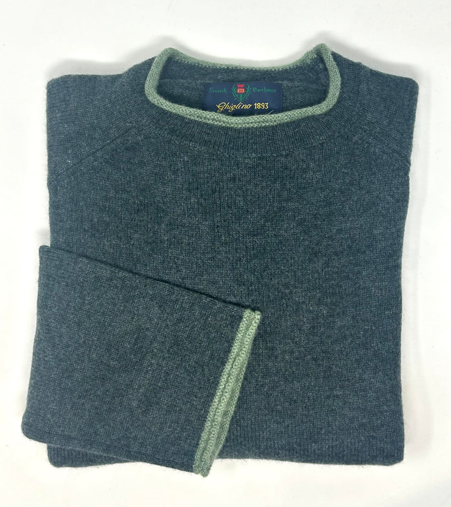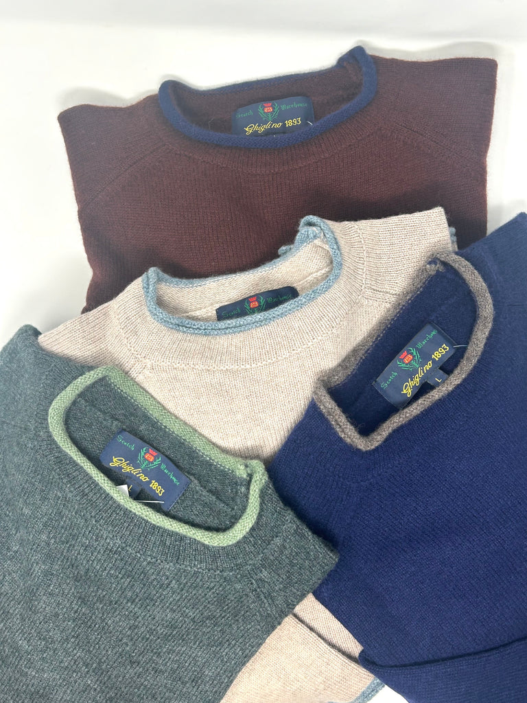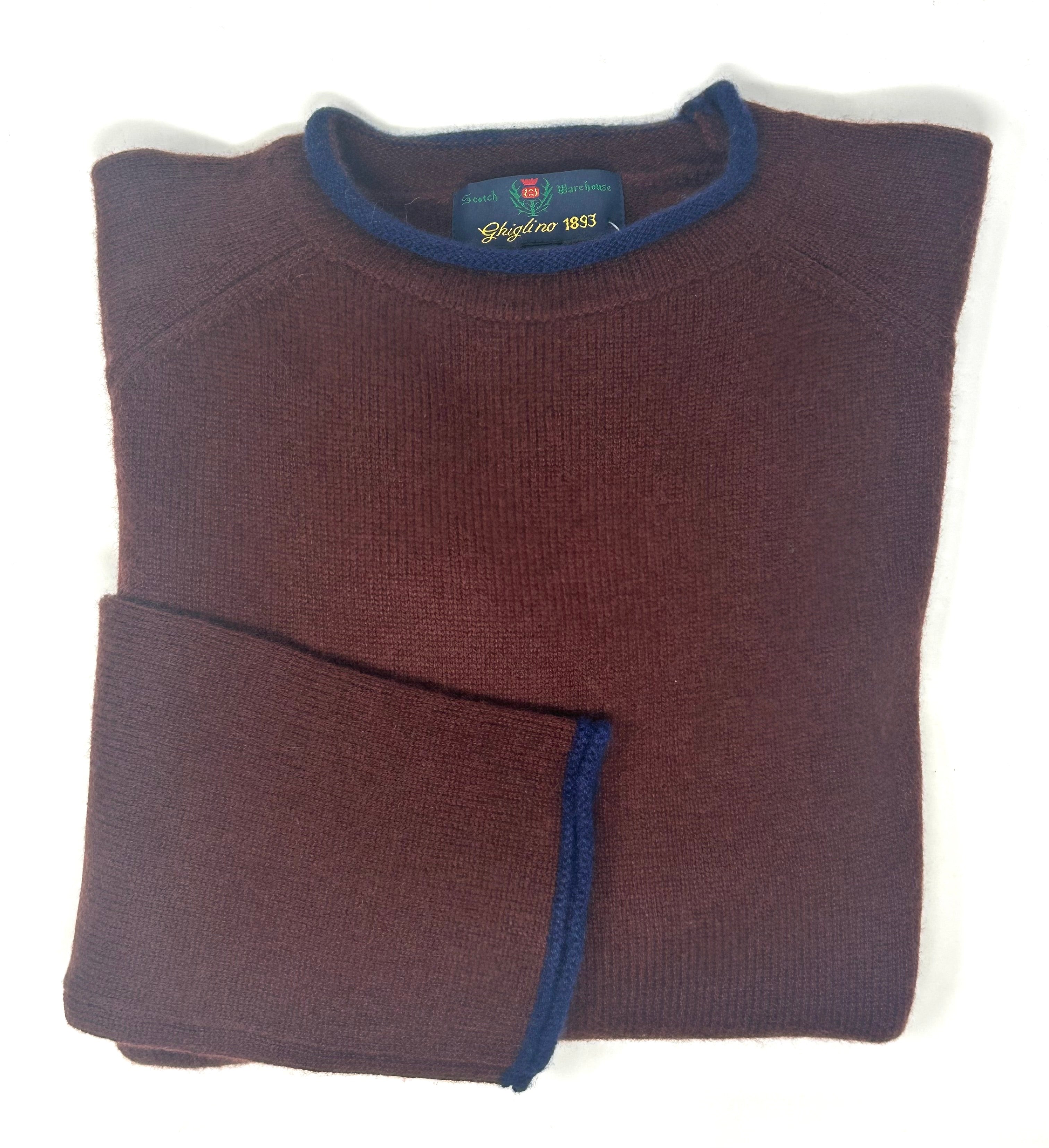 Maglione collo rotolino con bordino in contrasto sul collo e suo polsini, lavorato sulla 7