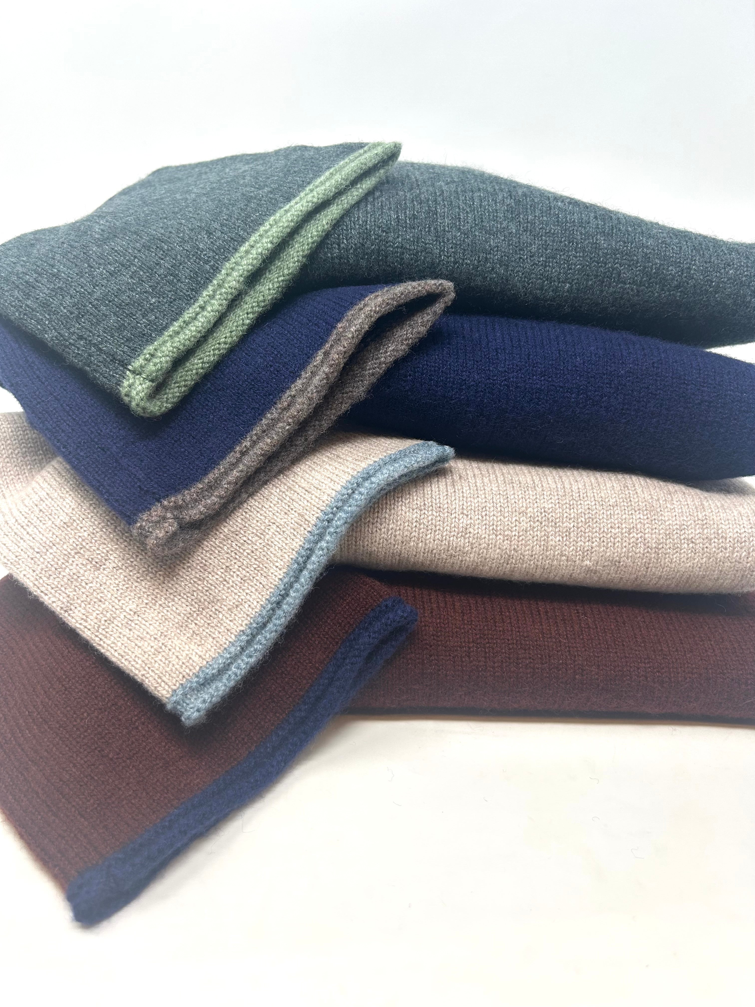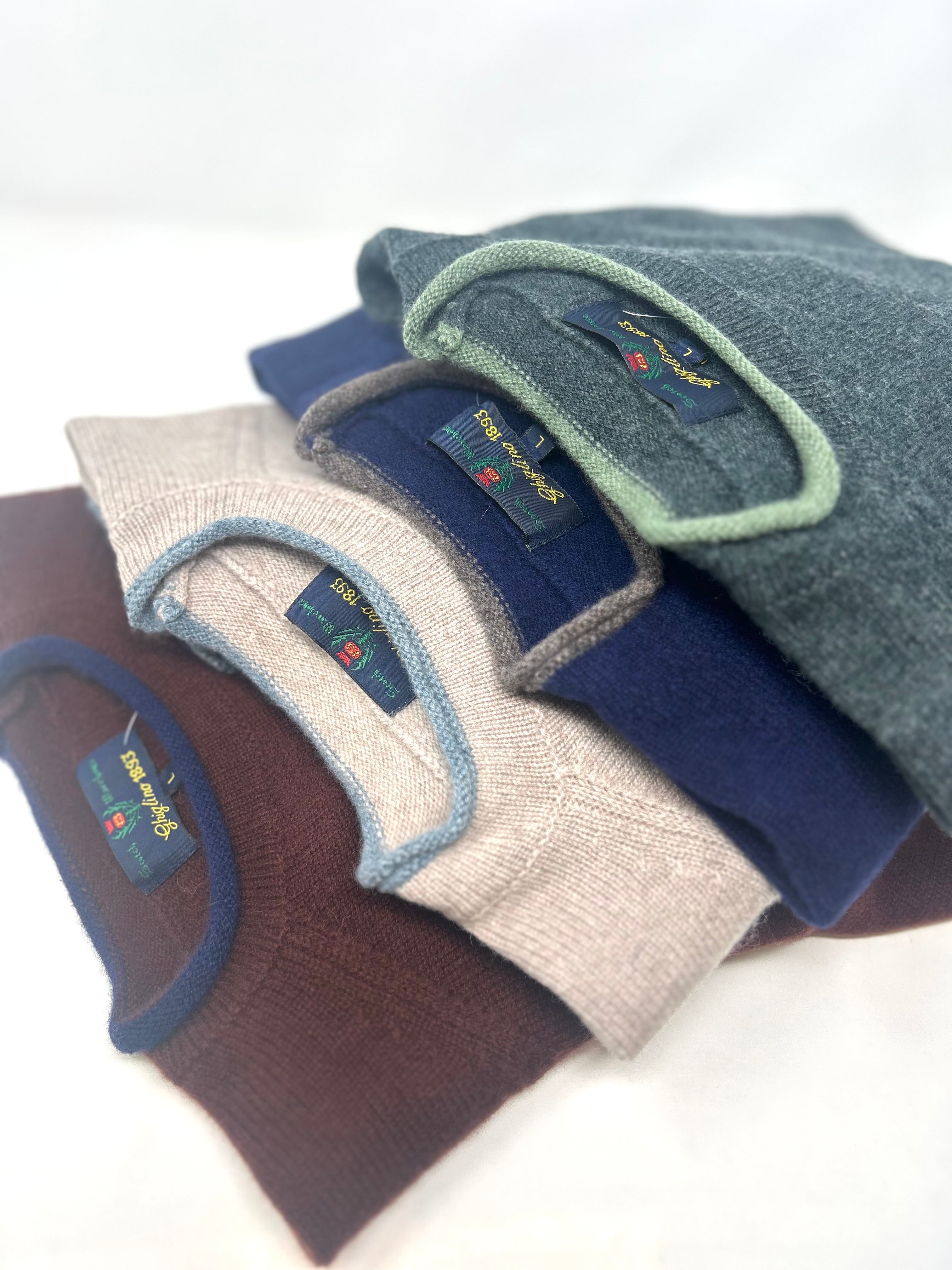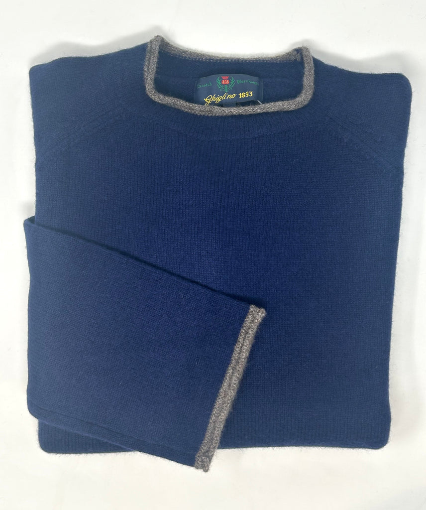 Maglione collo rotolino con bordino in contrasto sul collo e suo polsini, lavorato sulla 7