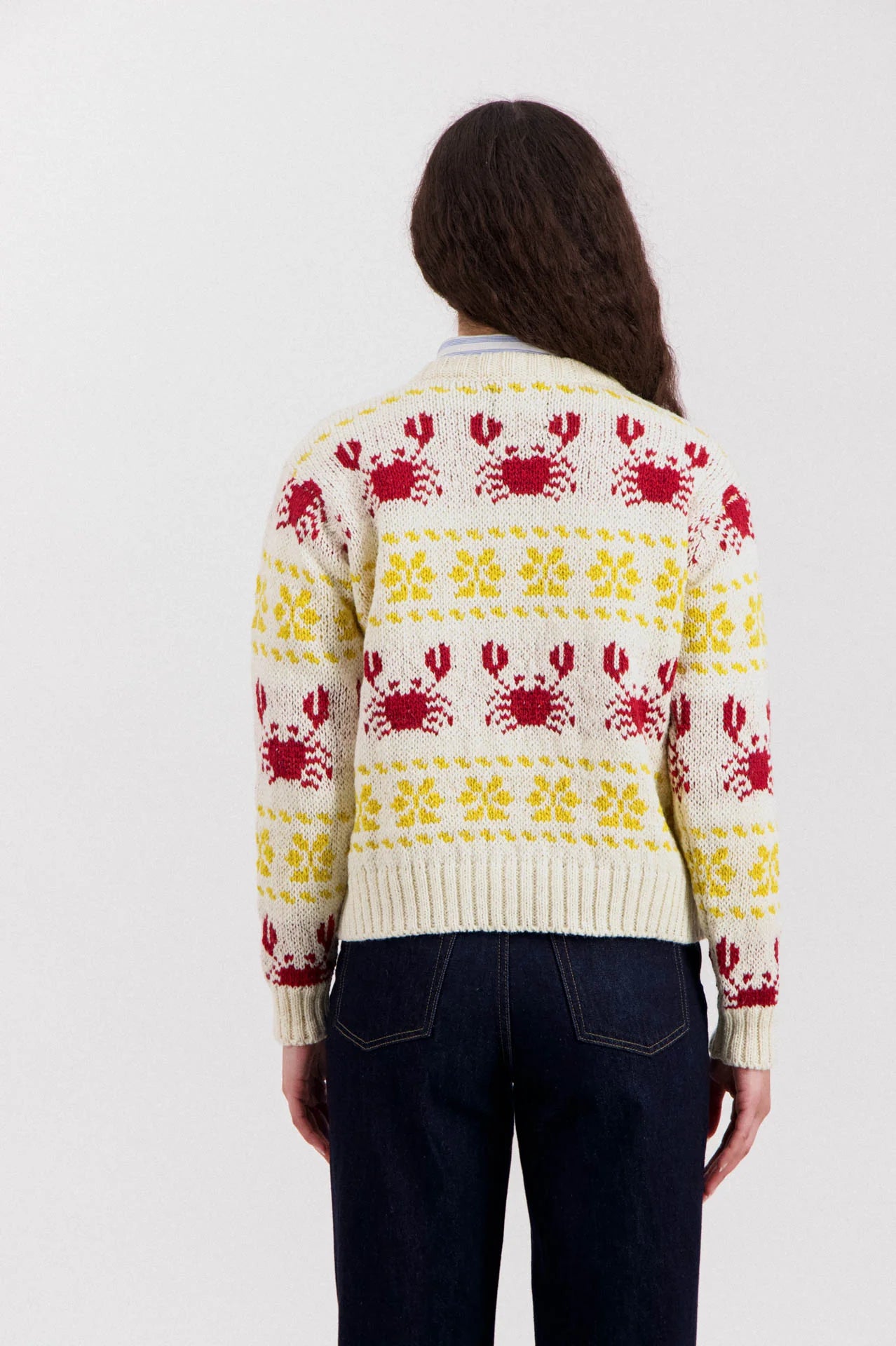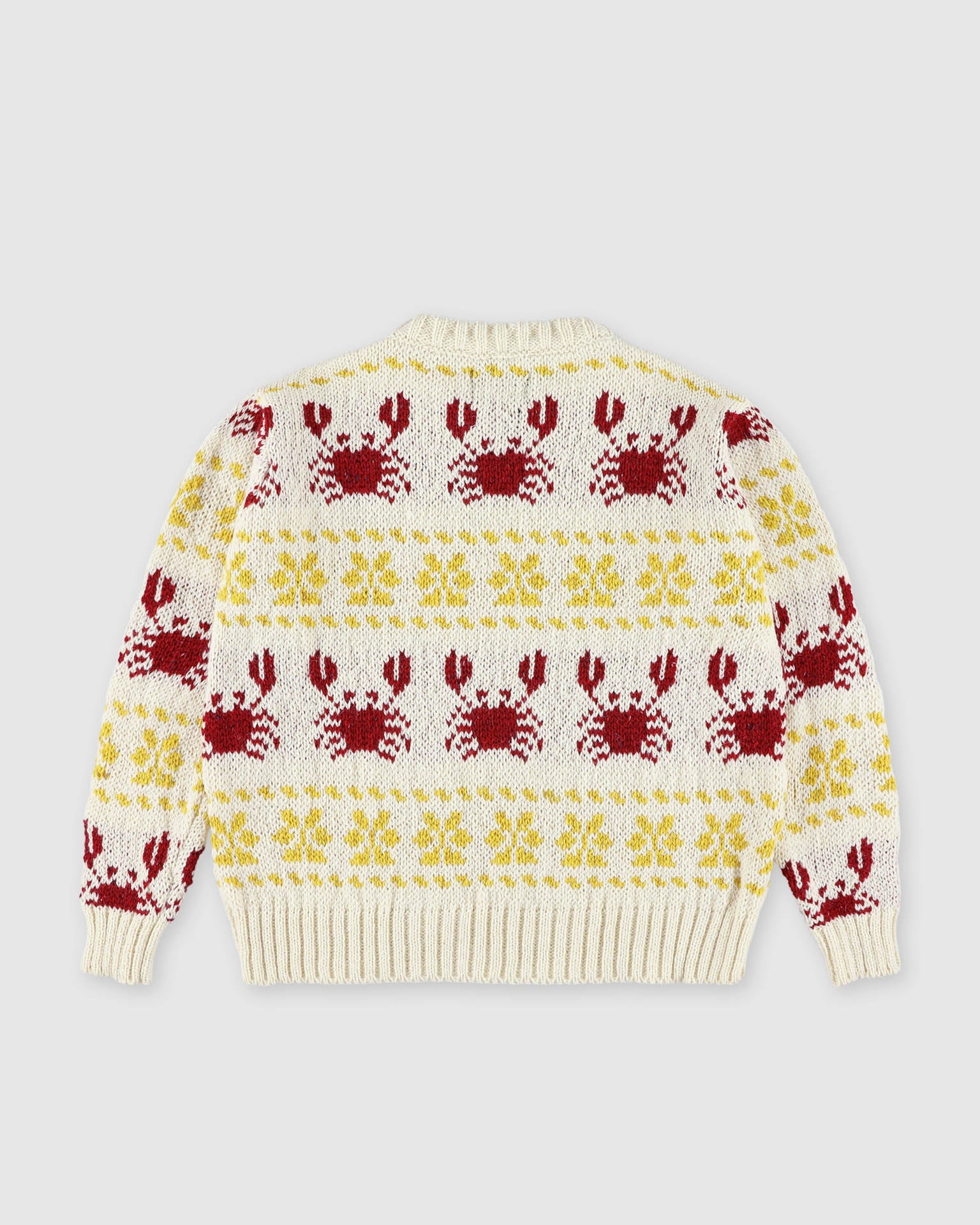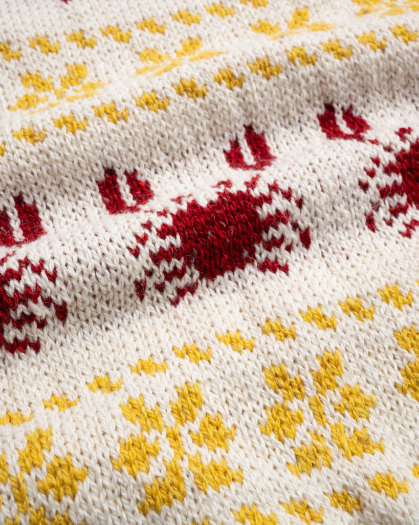 Crabs in Space è un maglione girocollo lavorato a maglia in Irlanda e presenta un motivo ripetuto di granchi e motivi geometrici.