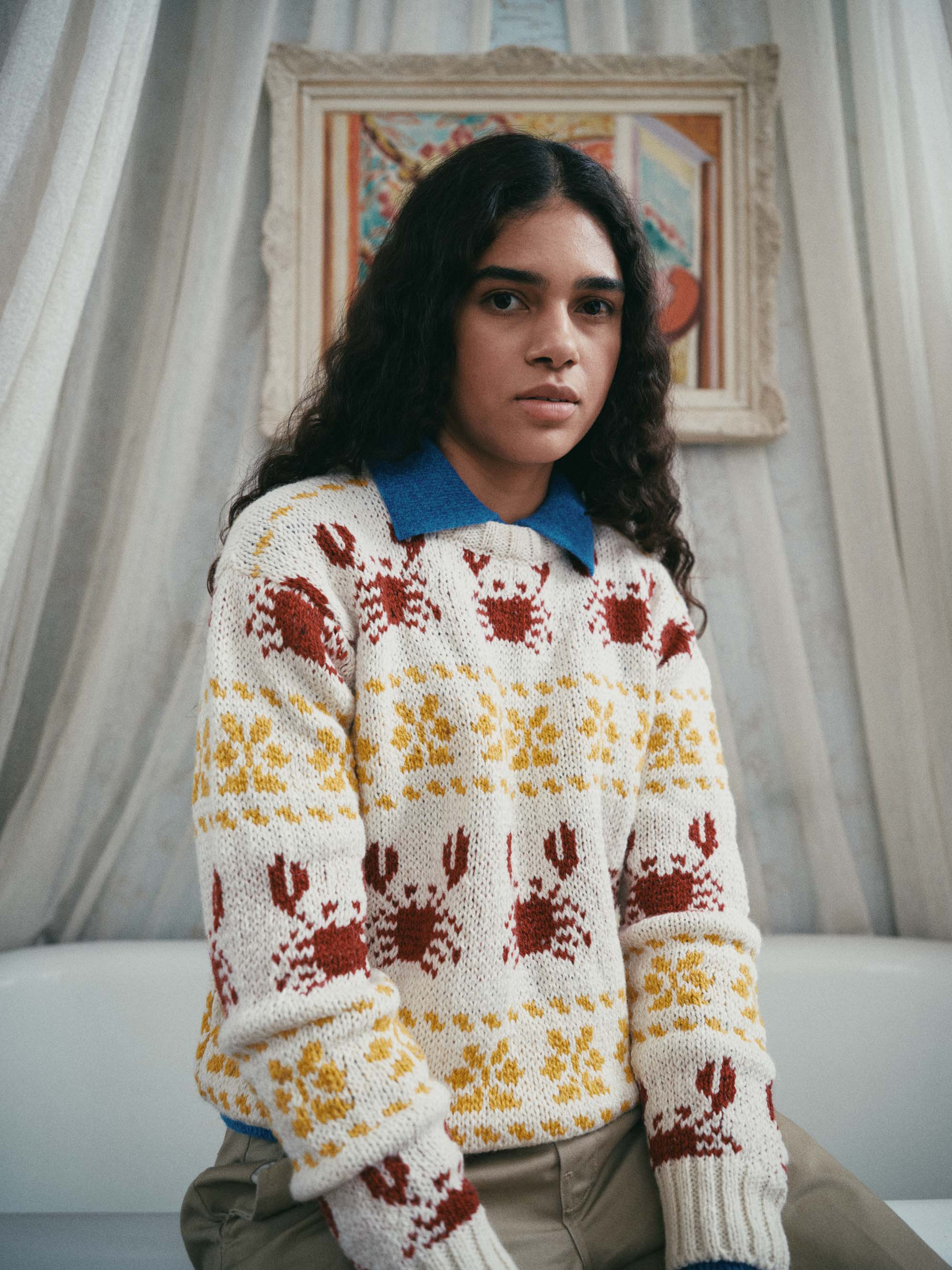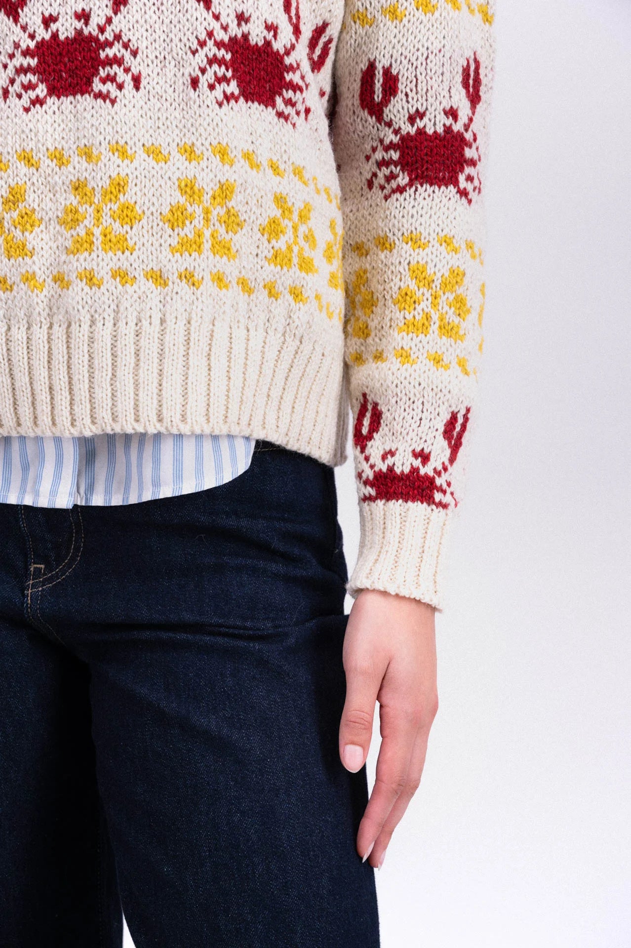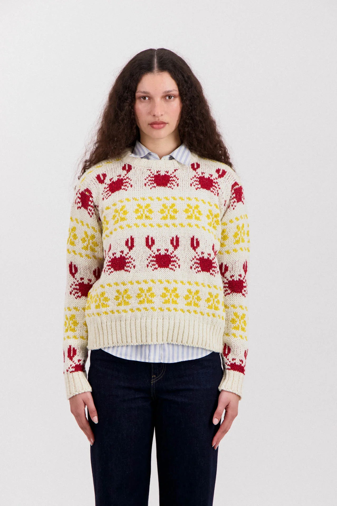 Crabs in Space è un maglione girocollo lavorato a maglia in Irlanda e presenta un motivo ripetuto di granchi e motivi geometrici.