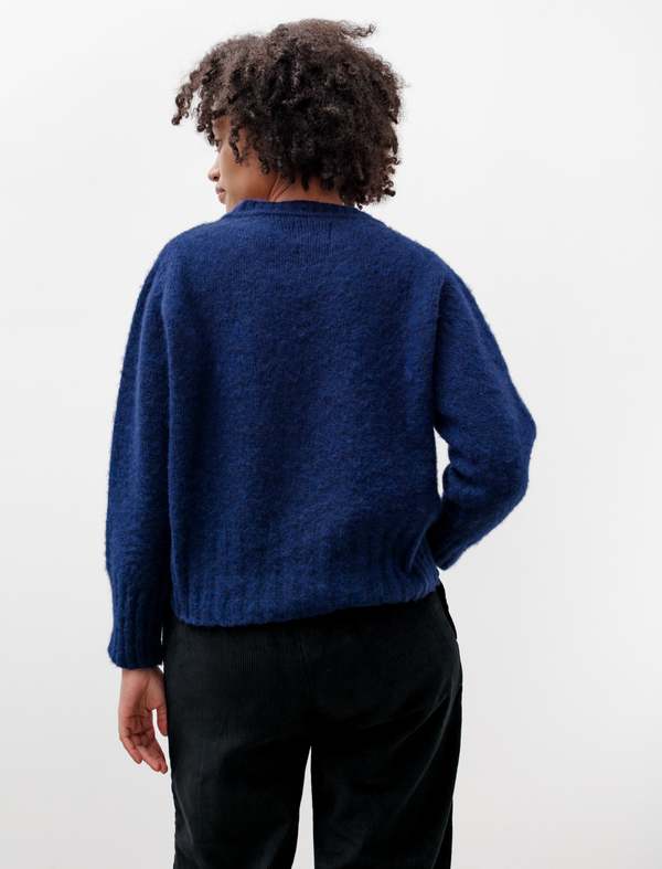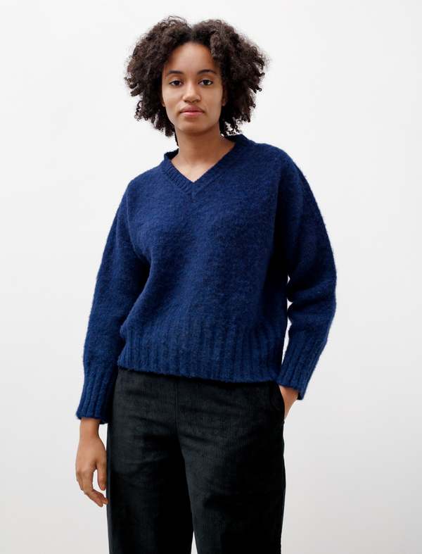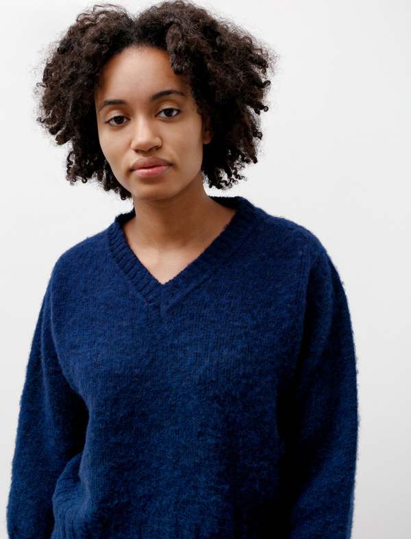 Maglione howlin scollo v linea scatoletta. Lavorato a maglia e rifinito a mano con cura in Scozia, è un punto fermo del guardaroba per il freddo. Presenta maniche lunghe, girocollo, polsini a coste e orlo. L'iterazione di questa stagione include un classico lavaggio blu navy.