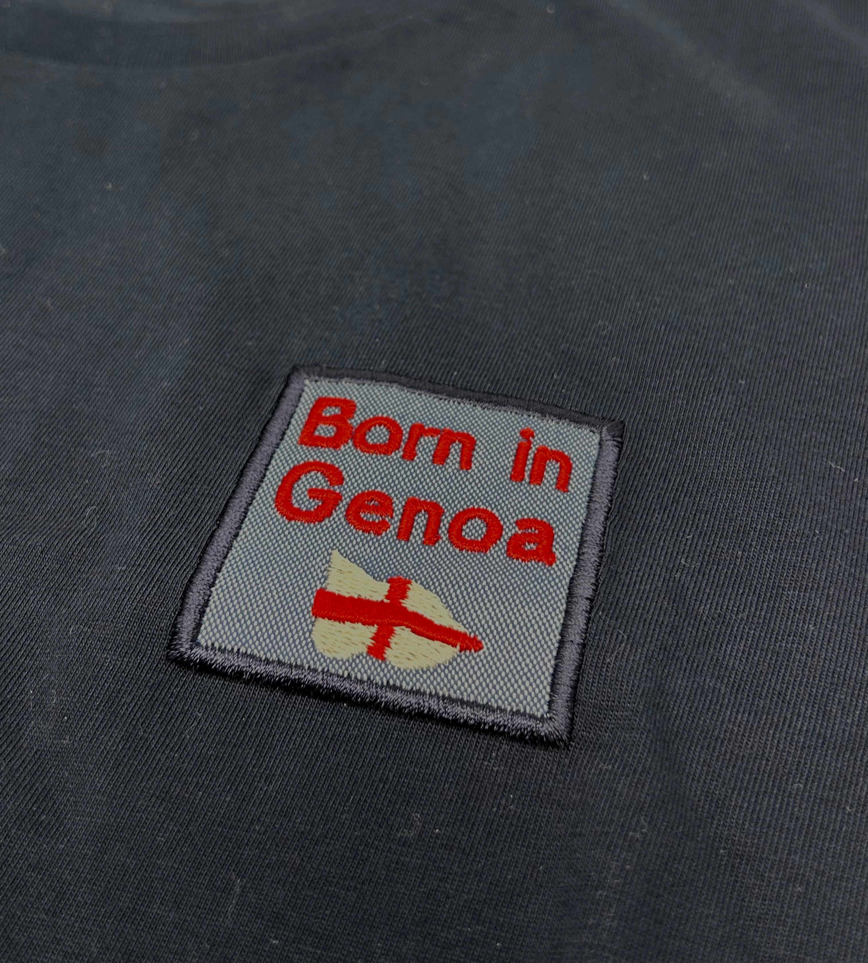 T-shirt con patch tessuto jeans " BORN IN GENOA ” e bandierina di Genova.