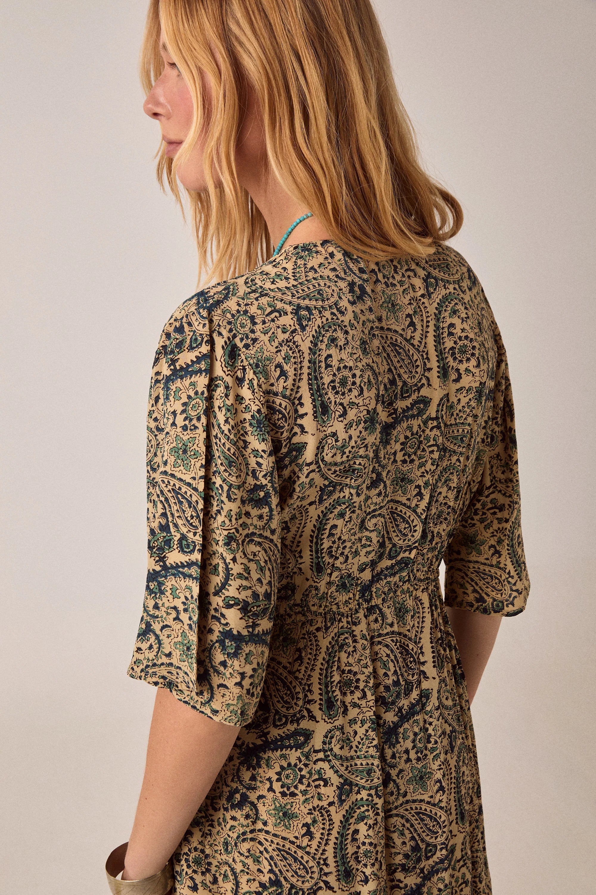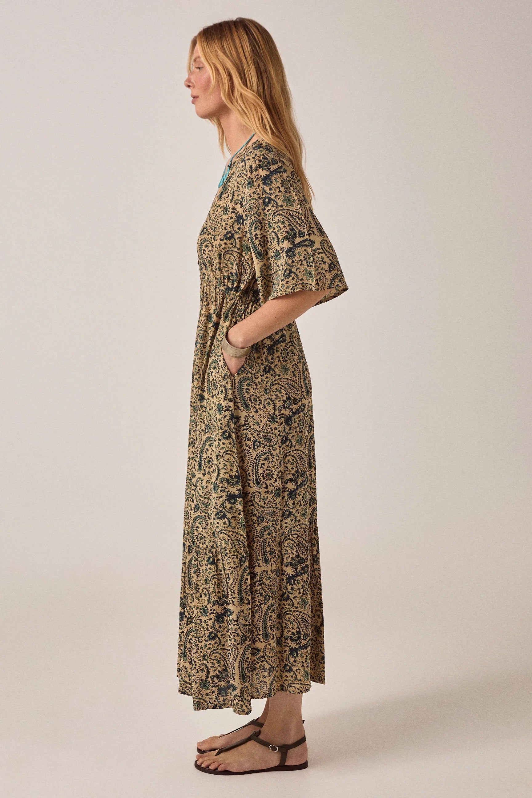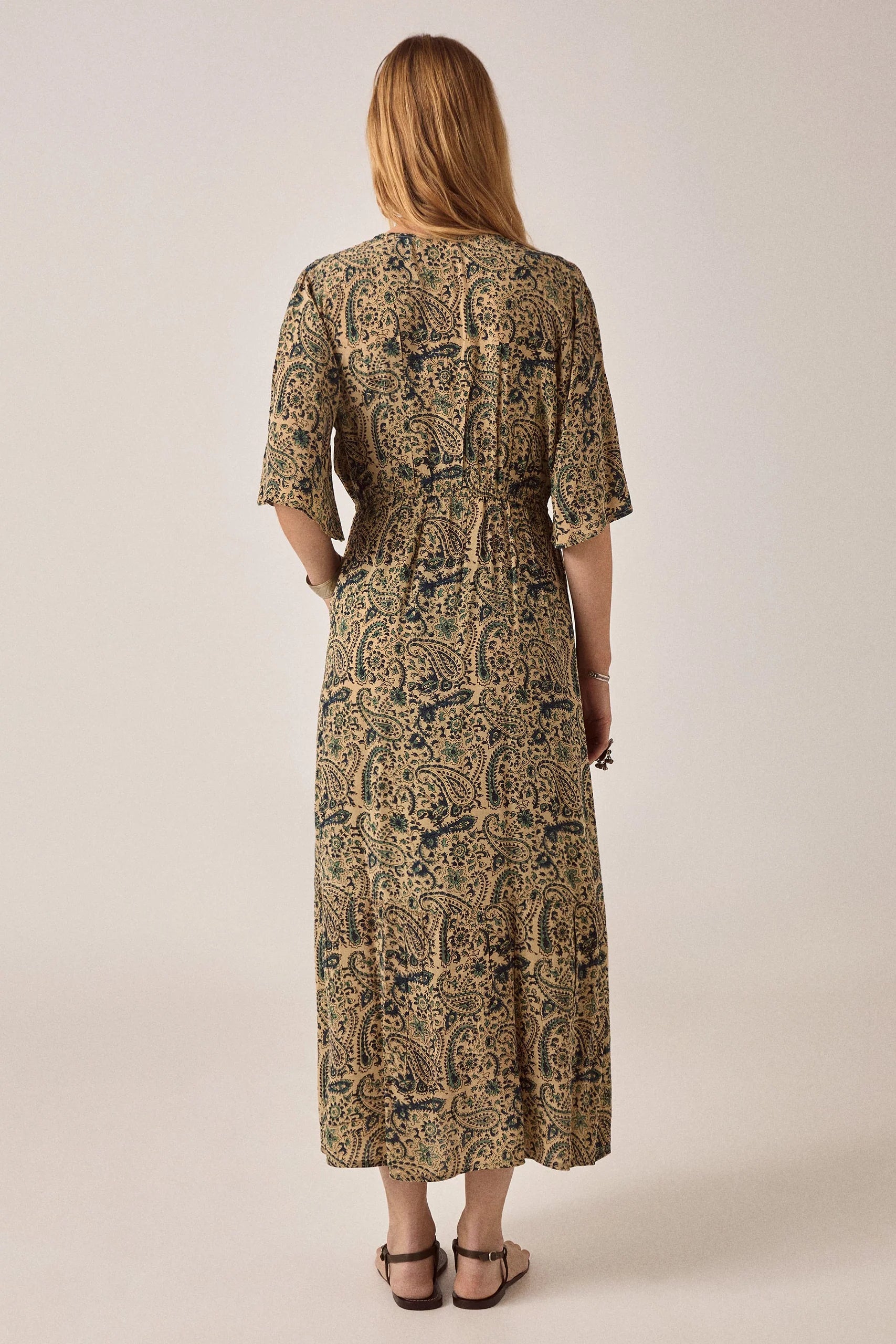 ABITO FLOREALE MANUELA Cashmere Pacifico Paisley Scuro Eleganza senza compromessi. Questo abito floreale è realizzato in viscosa pregiata, perfetto per chi ricerca comfort e stile in ogni occasione. Il design sofisticato con motivo paisley si adatta a qualsiasi silhouette, regalando una vestibilità naturale e lusinghiera. La lunghezza totale di 134 cm (taglia S) crea linee affusolate e moderne. La modella indossa la taglia S ed è alta 178 cm. La vestibilità è fedele alle taglie standard: se siete tra due taglie, consigliamo di scegliere la taglia più grande per il massimo comfort. Per preservare la qualità del tessuto, si consiglia il lavaggio a mano delicato. Un capo versatile che diventa subito un must-have del vostro guardaroba.