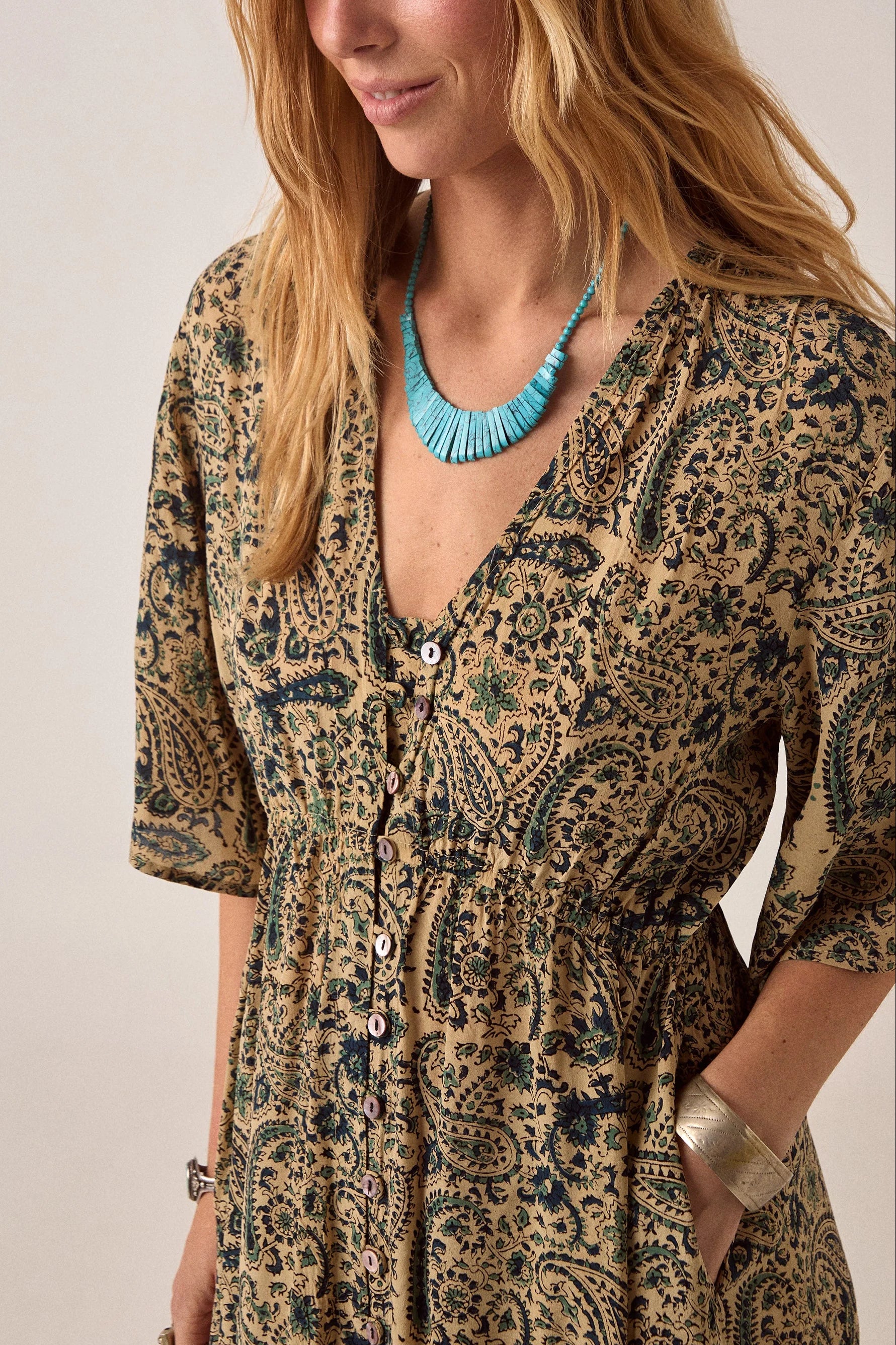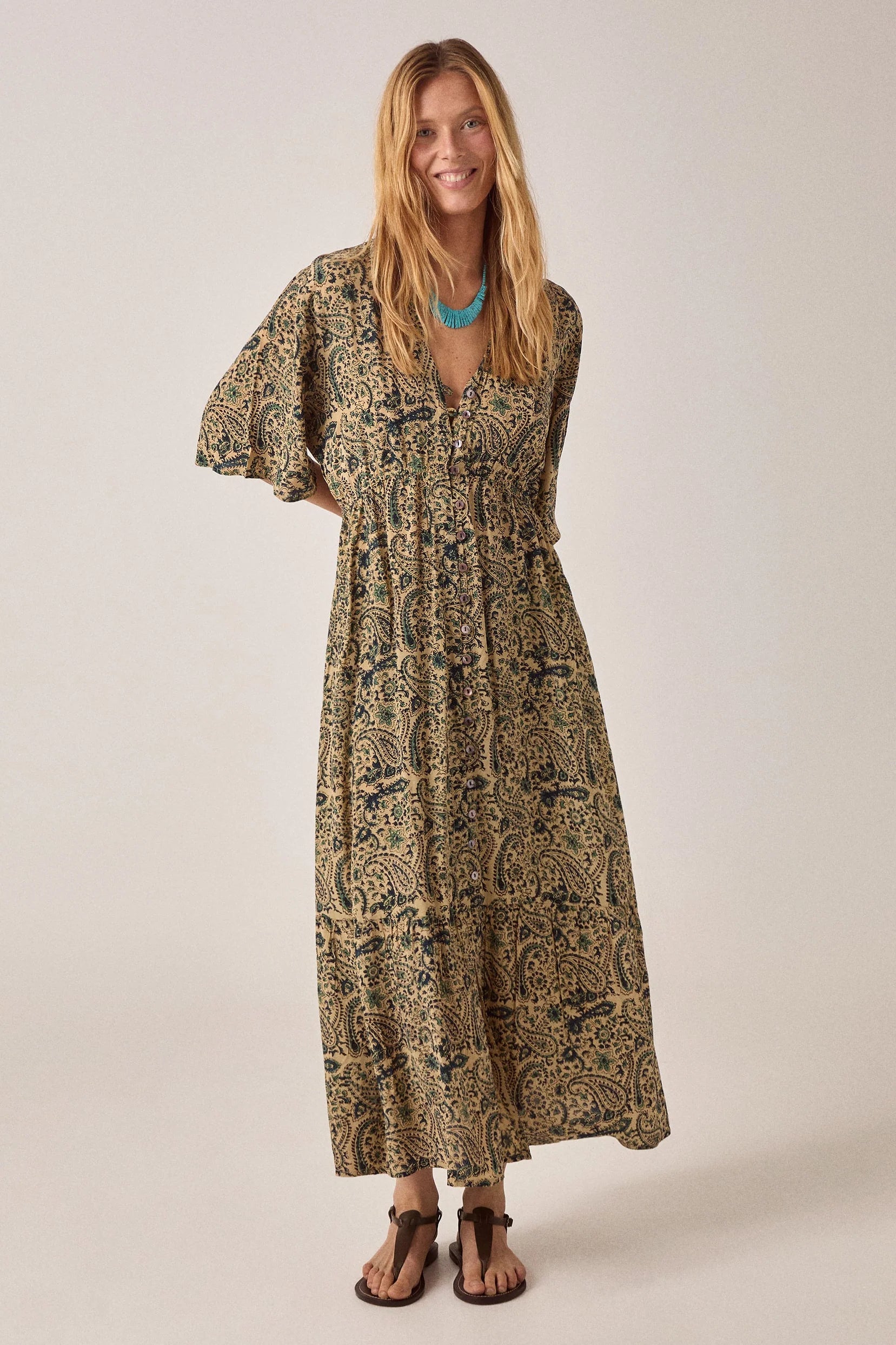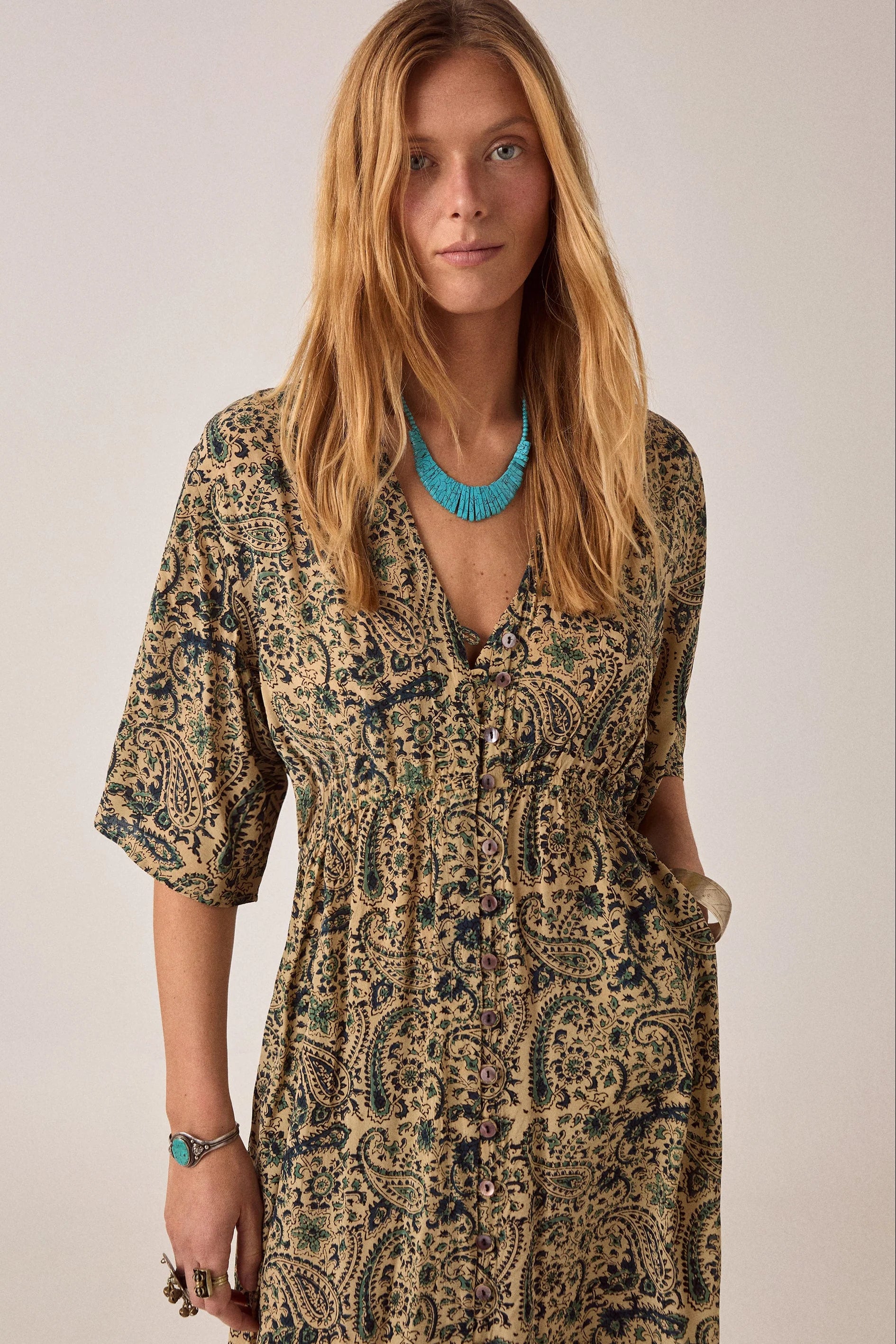 ABITO FLOREALE MANUELA Cashmere Pacifico Paisley Scuro Eleganza senza compromessi. Questo abito floreale è realizzato in viscosa pregiata, perfetto per chi ricerca comfort e stile in ogni occasione. Il design sofisticato con motivo paisley si adatta a qualsiasi silhouette, regalando una vestibilità naturale e lusinghiera. La lunghezza totale di 134 cm (taglia S) crea linee affusolate e moderne. La modella indossa la taglia S ed è alta 178 cm. La vestibilità è fedele alle taglie standard: se siete tra due taglie, consigliamo di scegliere la taglia più grande per il massimo comfort. Per preservare la qualità del tessuto, si consiglia il lavaggio a mano delicato. Un capo versatile che diventa subito un must-have del vostro guardaroba.