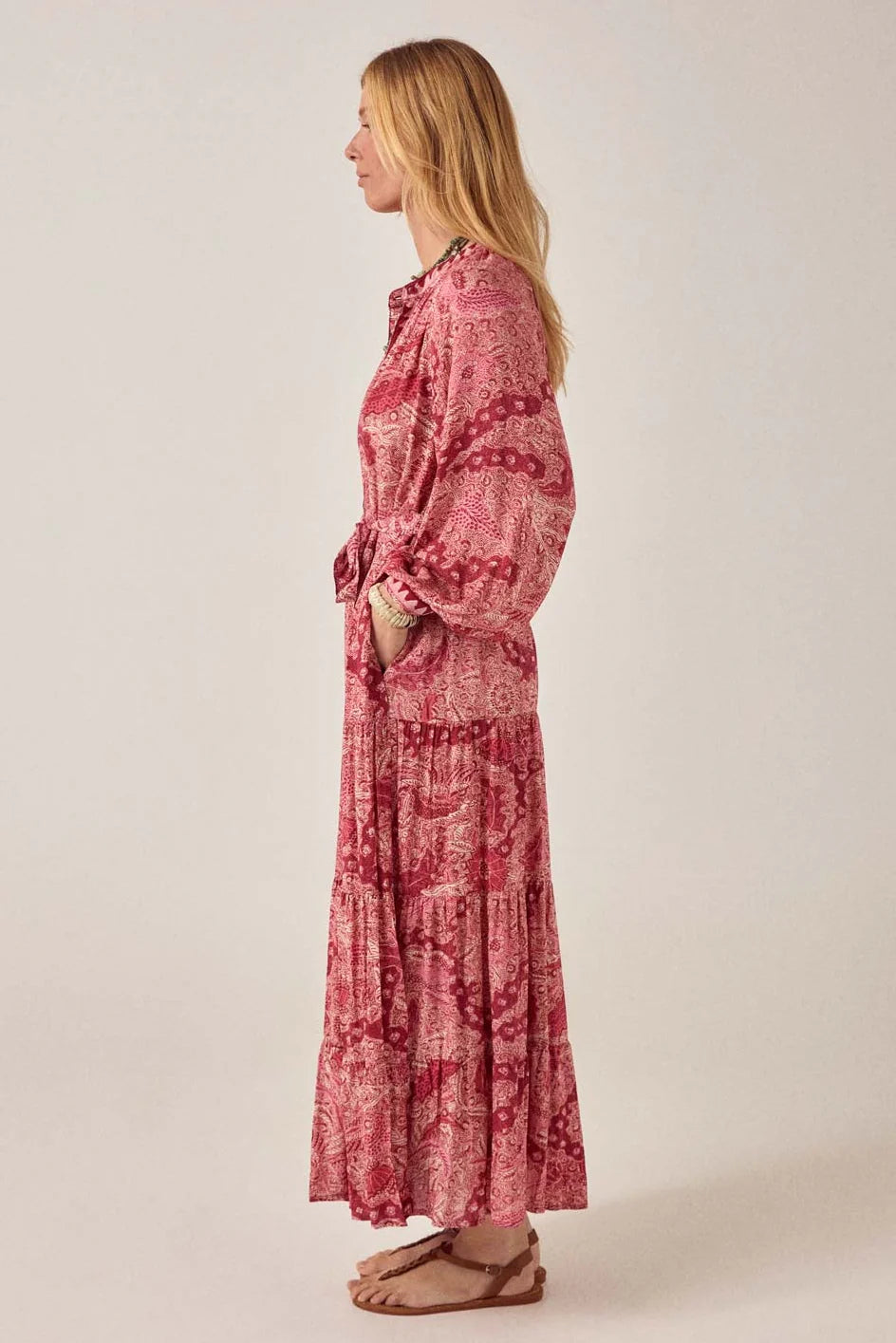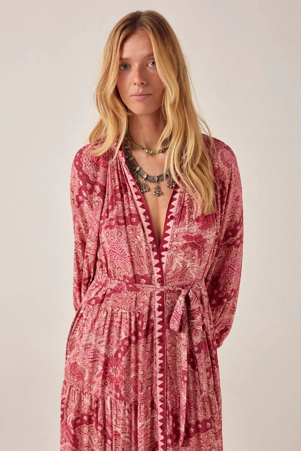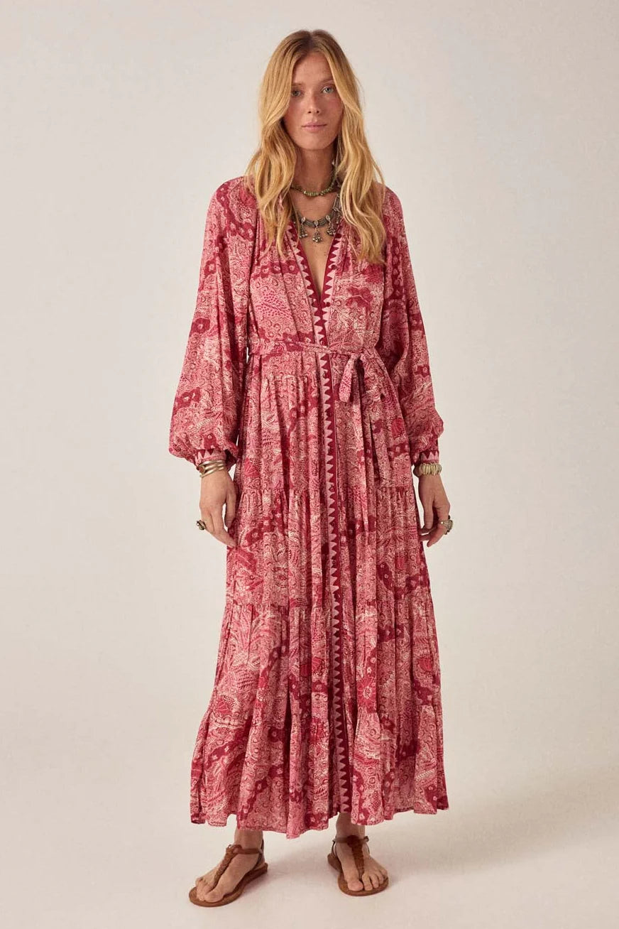 Abito lungo in viscosa di pura eleganza, perfetto per chi ama lo stile bohemien con un tocco sofisticato. Il tessuto rosso caldo è impreziosito da un affascinante motivo Java con paisley e dettagli floreali in granato profondo e rosa polveroso che si estendono per tutta la lunghezza.