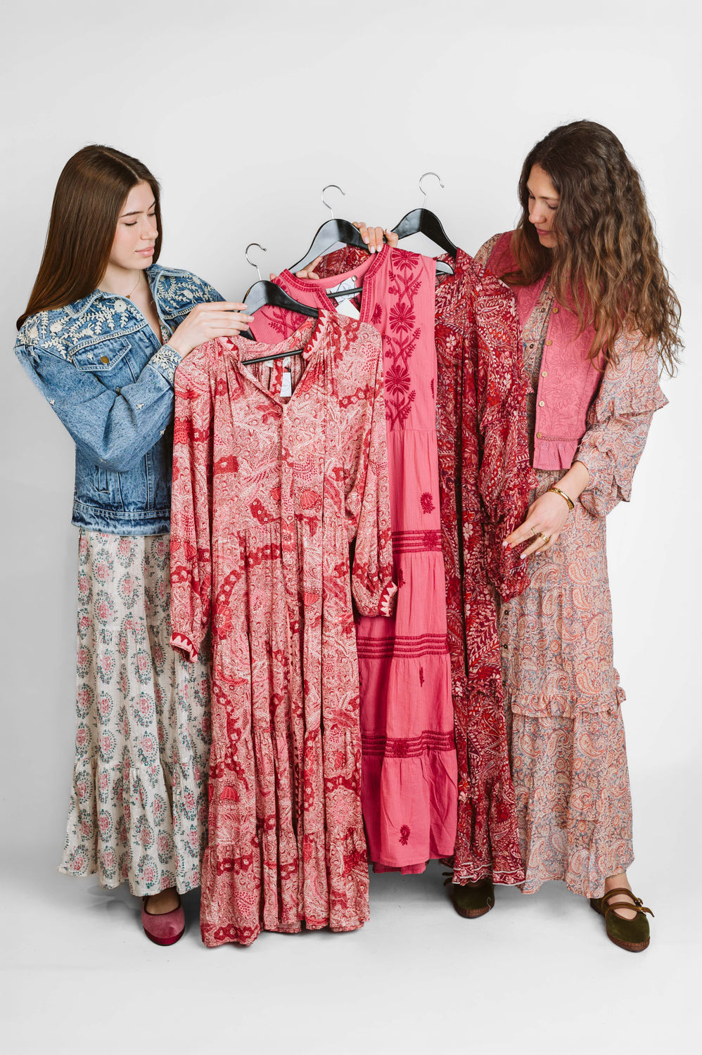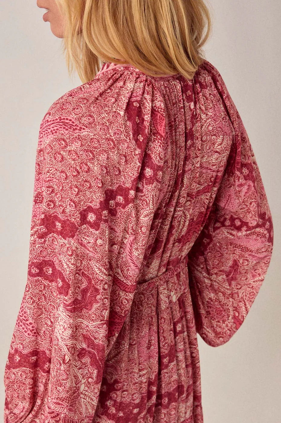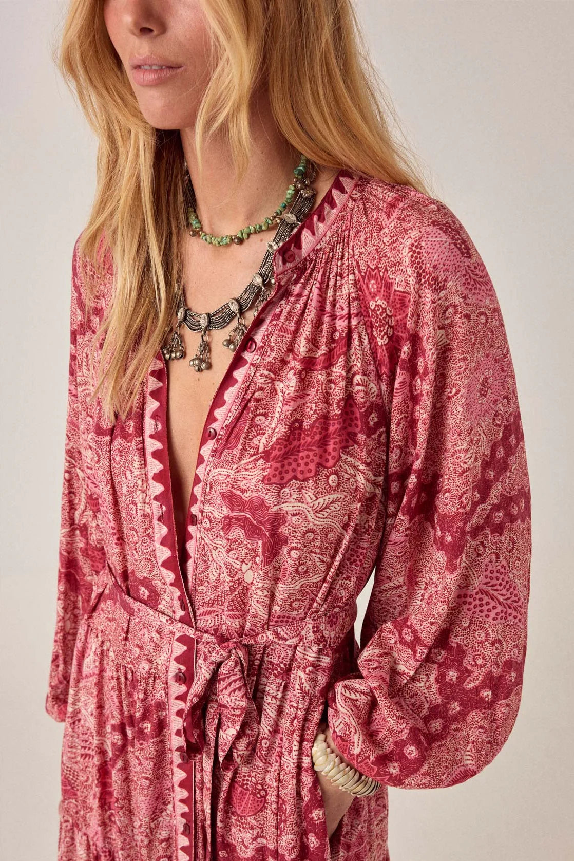 Abito lungo in viscosa di pura eleganza, perfetto per chi ama lo stile bohemien con un tocco sofisticato. Il tessuto rosso caldo è impreziosito da un affascinante motivo Java con paisley e dettagli floreali in granato profondo e rosa polveroso che si estendono per tutta la lunghezza.
