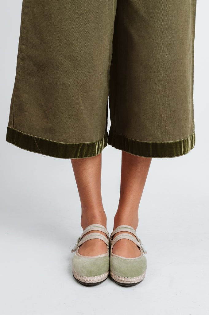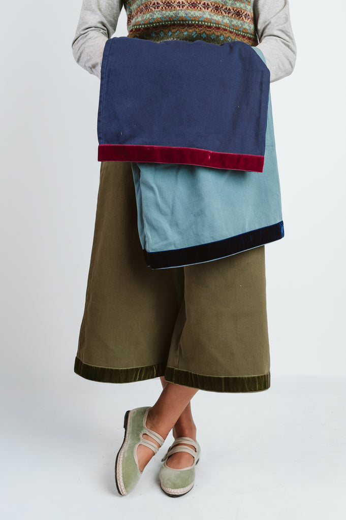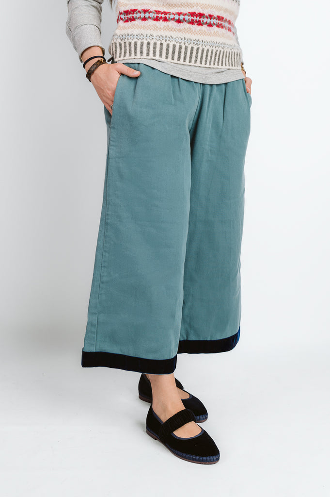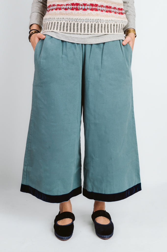 Gonna pantalone in cotone ecologico con elastico in vita e dettaglio sul fondo bordone in velluto a coste. Tinto in capo. Tasche laterali.