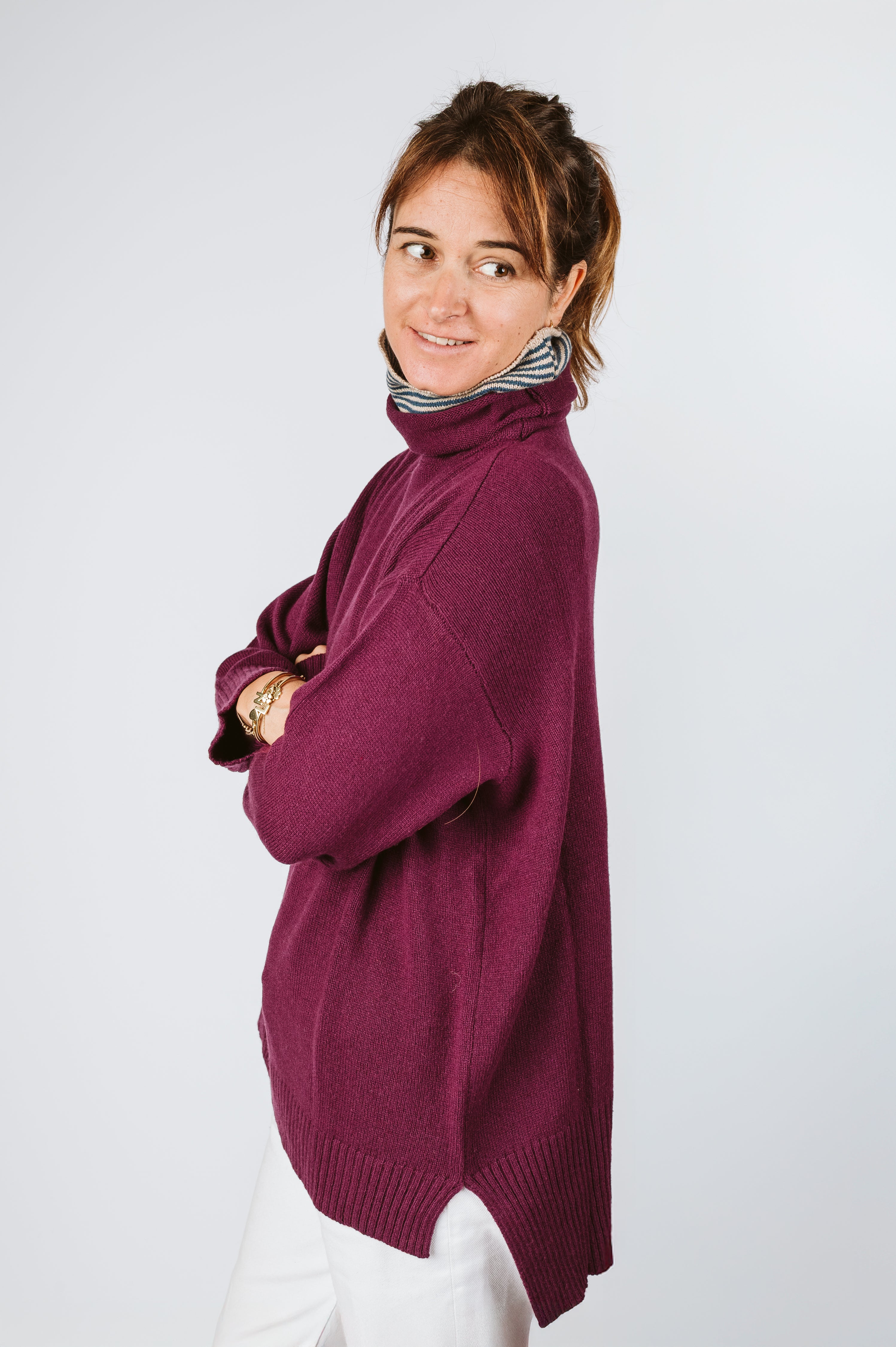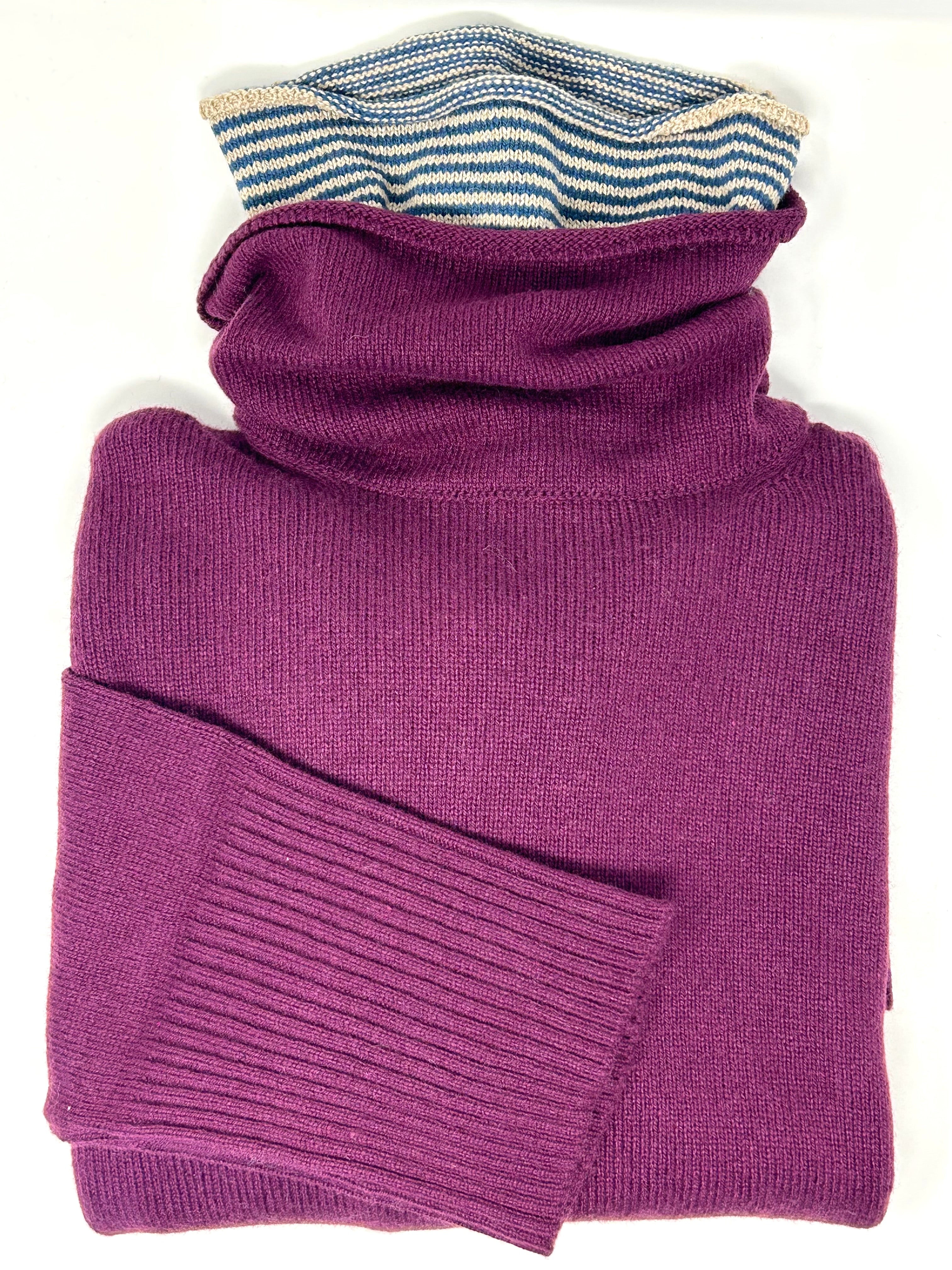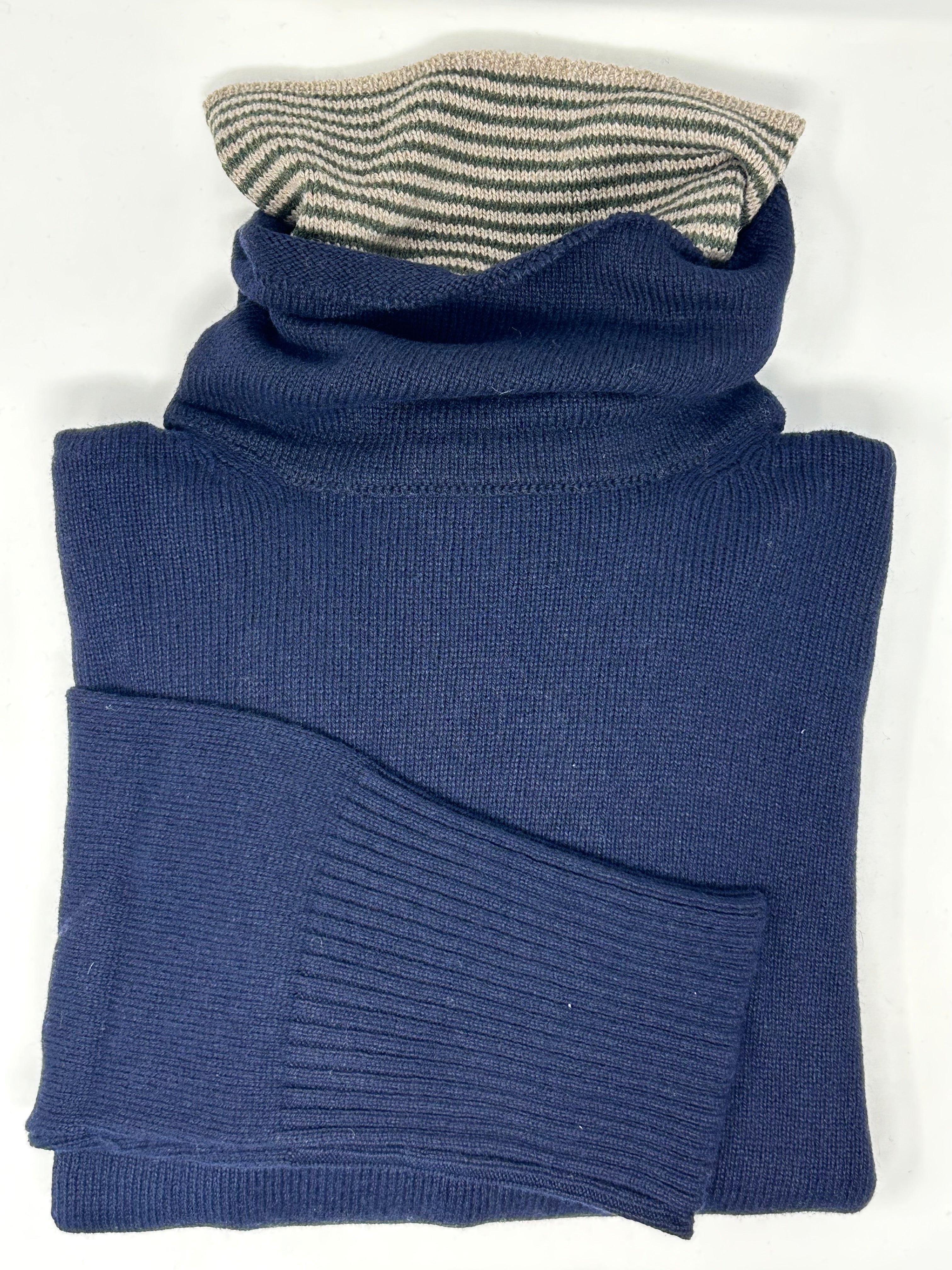 Maglione a collo alto caratterizzato da un elegante doppio collo, con lo strato interno decorato da un raffinato motivo a righine marine. La vestibilità oversize a uovo, arricchita da spacchetti laterali, conferisce un tocco di stile sofisticato. Disponibile in taglia unica.