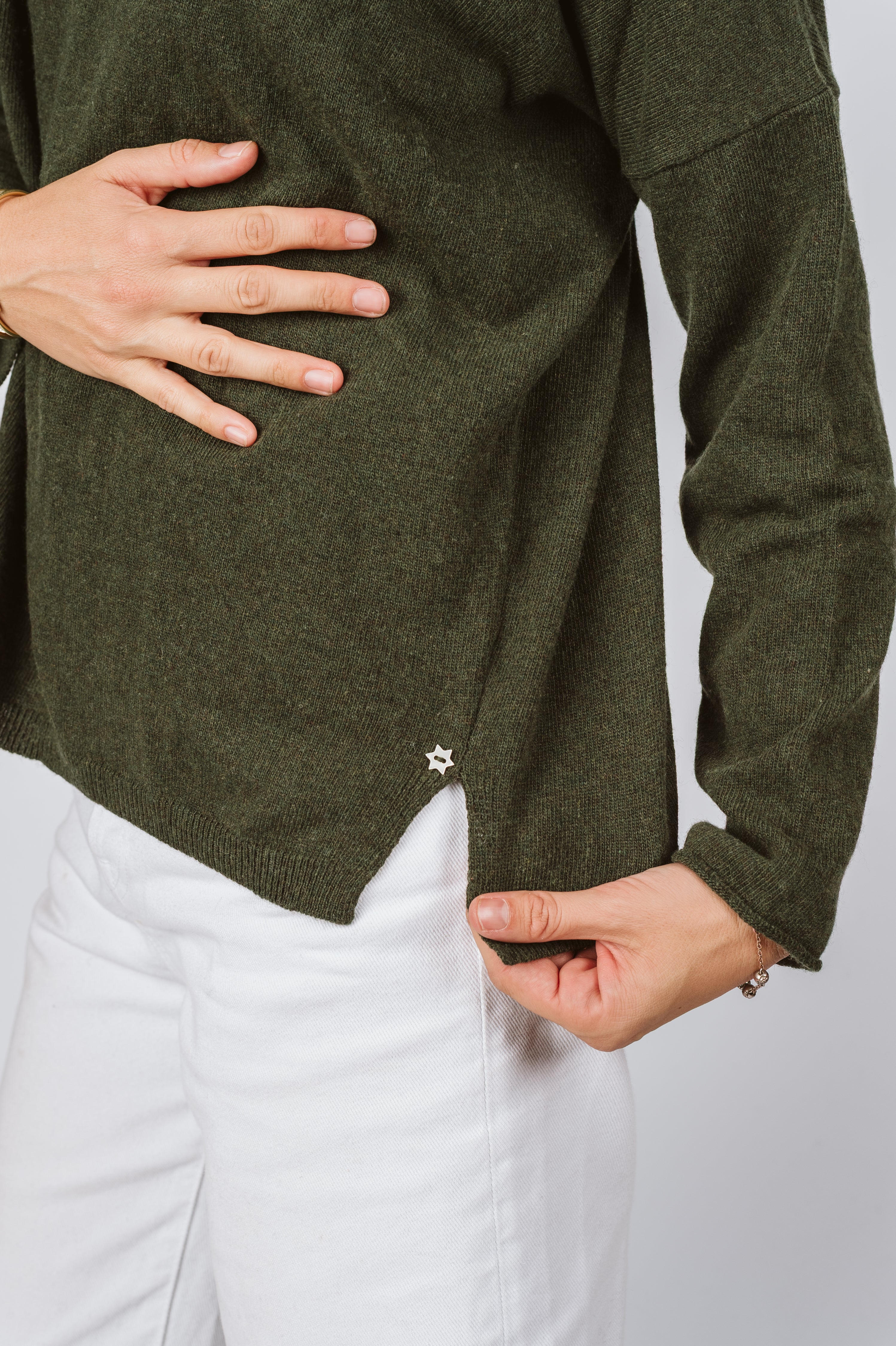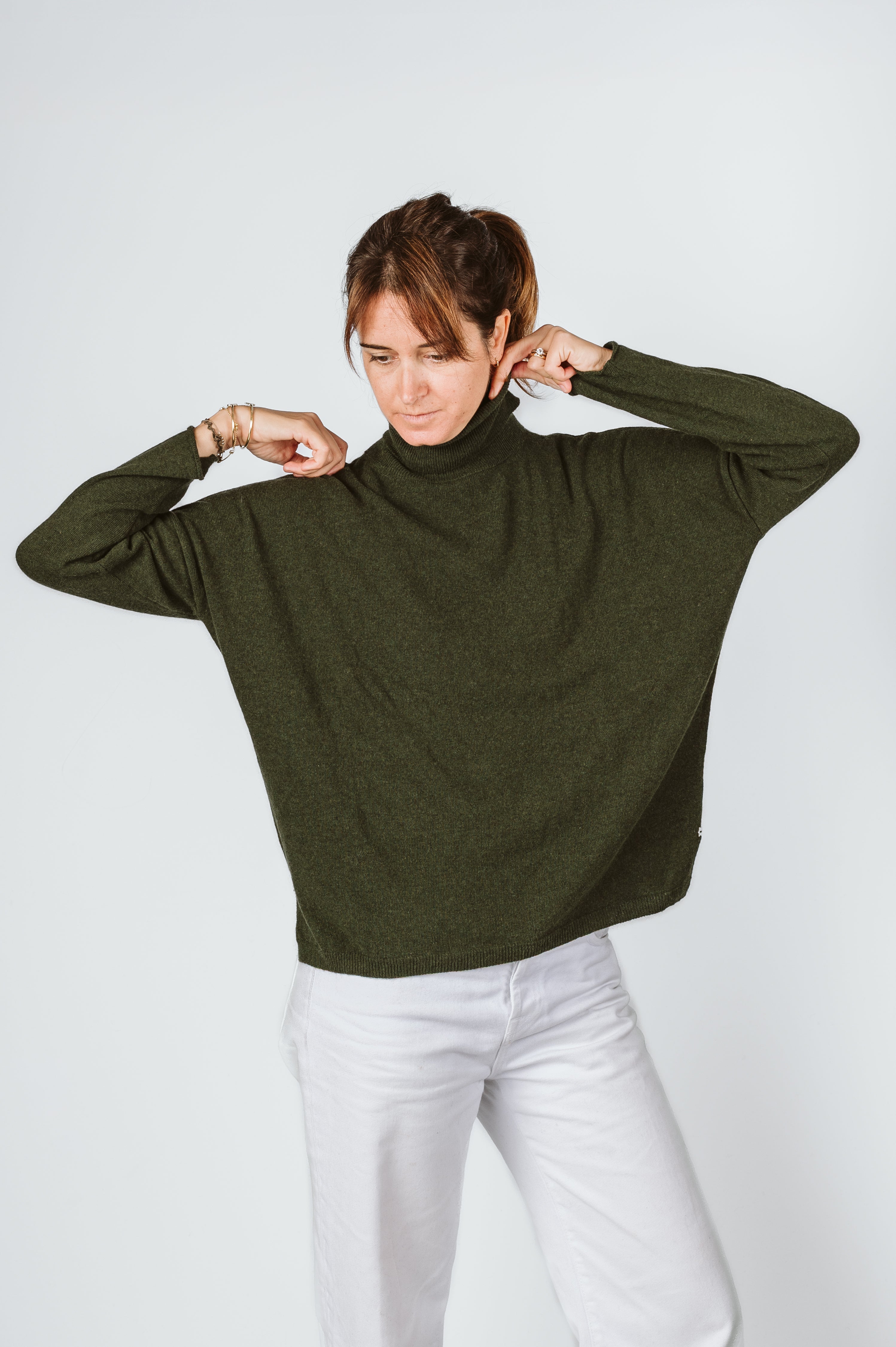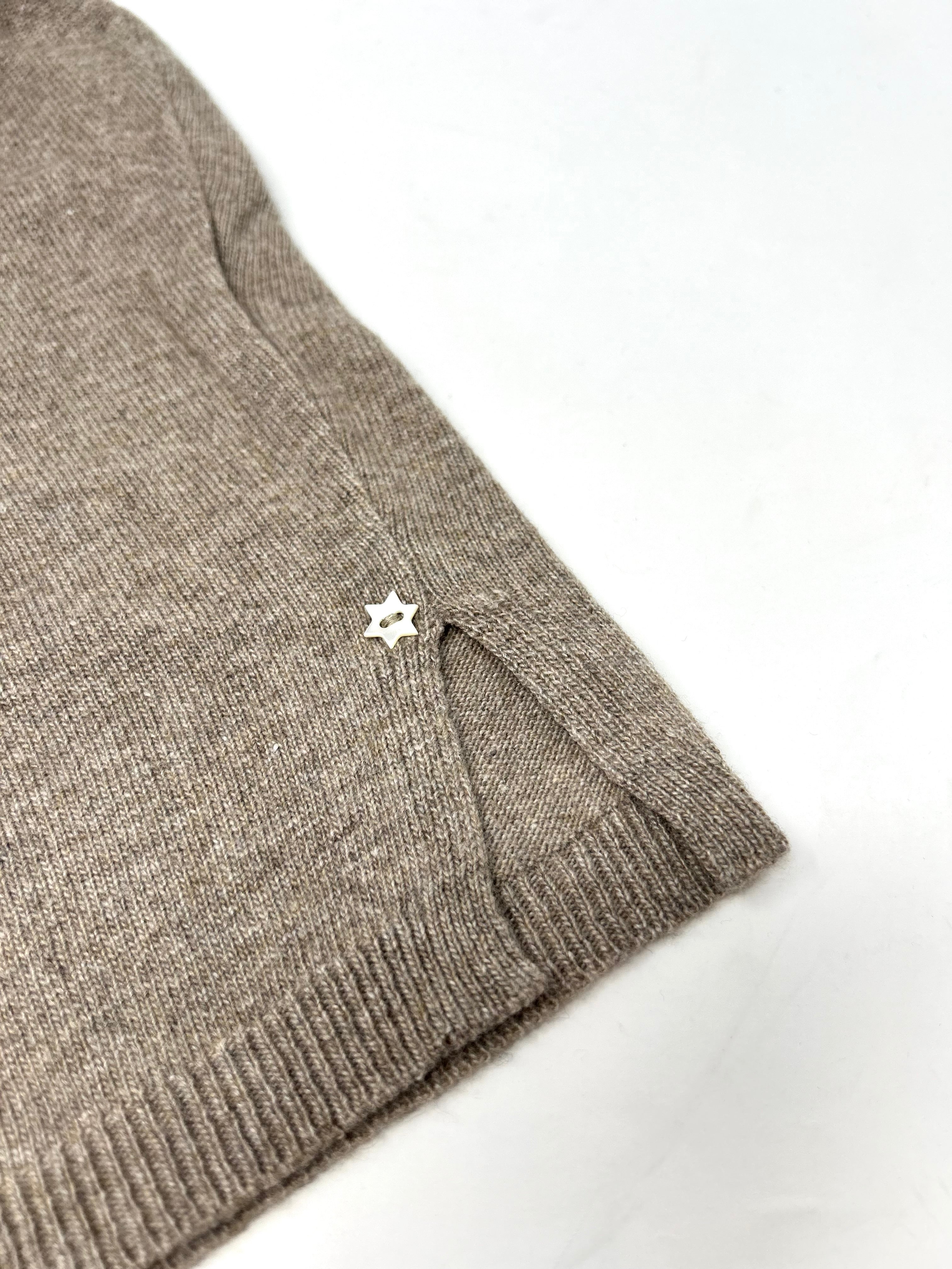 Maglione a collo alto in taglia unica, dalla vestibilità over, caratterizzato da spacchetti laterali rifiniti con eleganti bottoni in madreperla a forma di stellina.